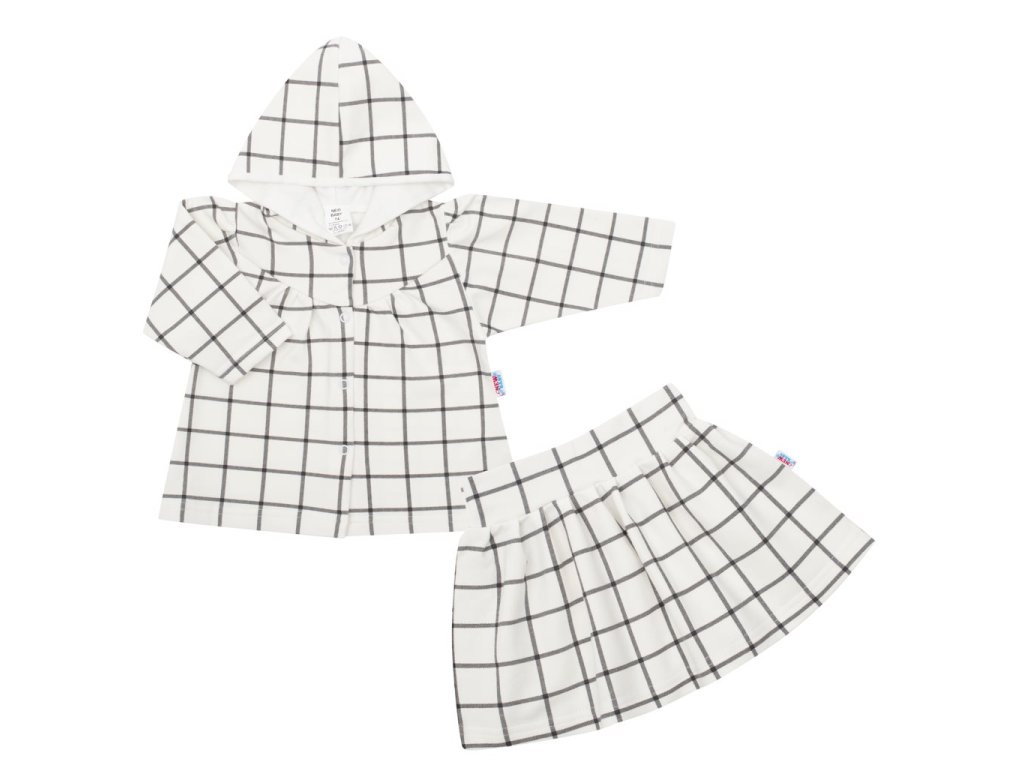 2-dielny komplet pre dievčatko New Baby Cool Girls. Komplet sa skladá z mikinky a sukienky. Mikinku Áčkového strihu zdobí praktická kapucňa podšitá bavlnenou podšívkou a stále moderný kockovaný vzor. Zapínanie na cvočky po celej dĺžke. Kolový strih sukienky zdobí širší pás s gumičkou. Krásny komplet do šatníka malých parádníc. Materiál: 95% bavlna, 5% elastan.Dodatočné parametre