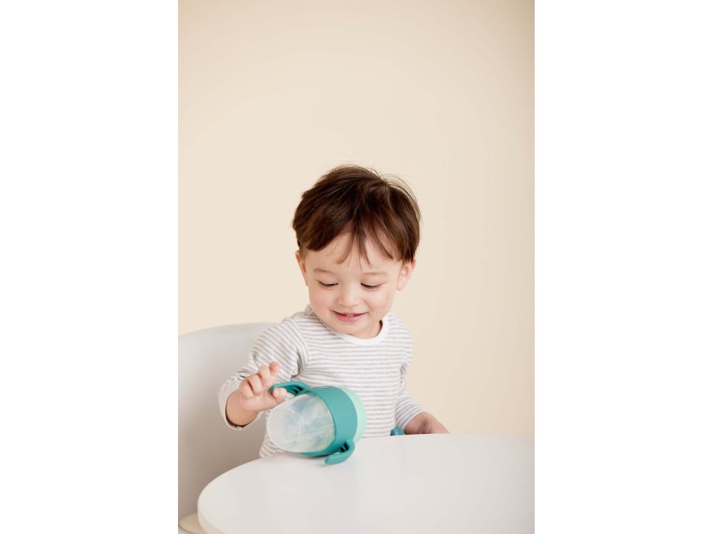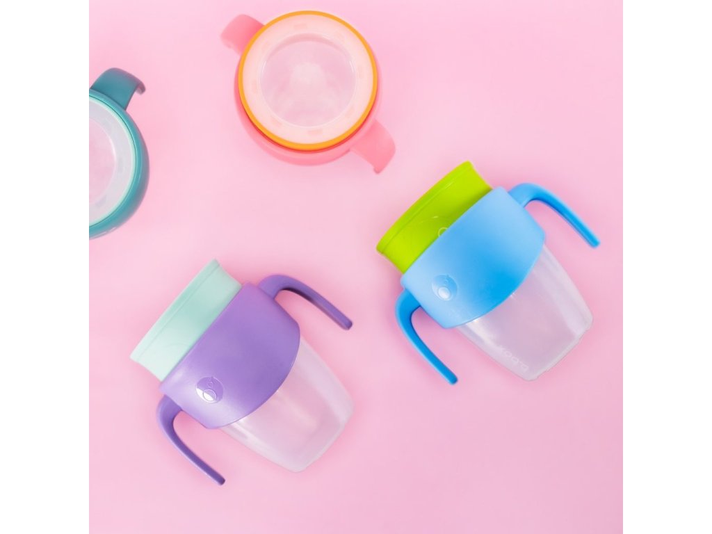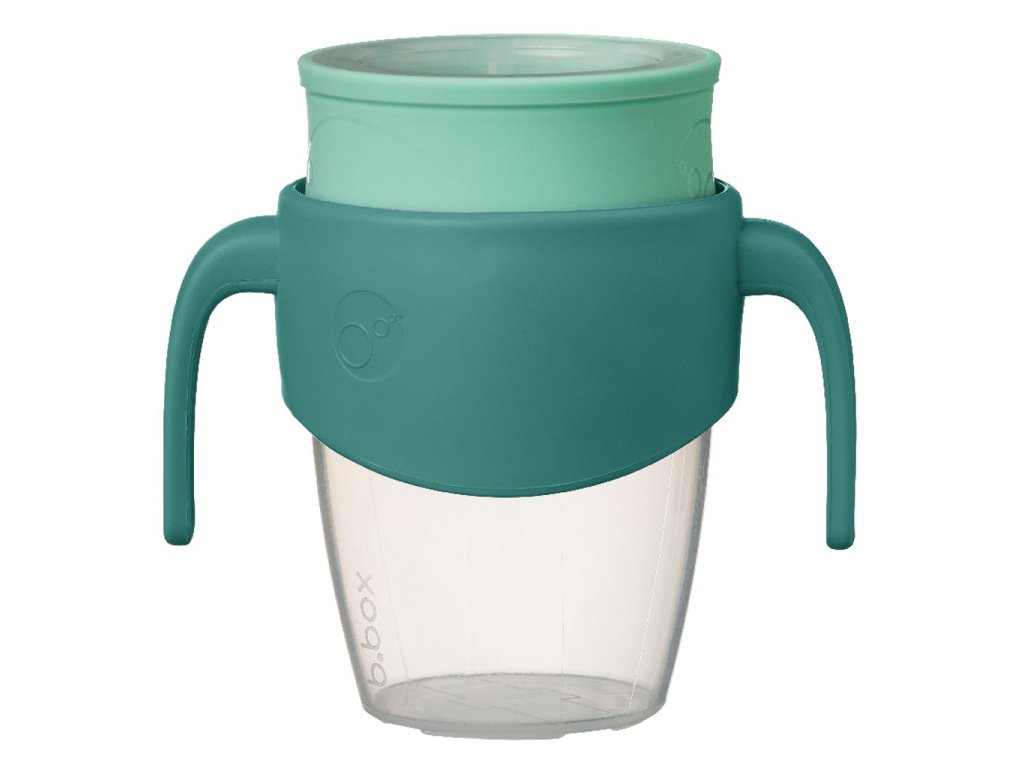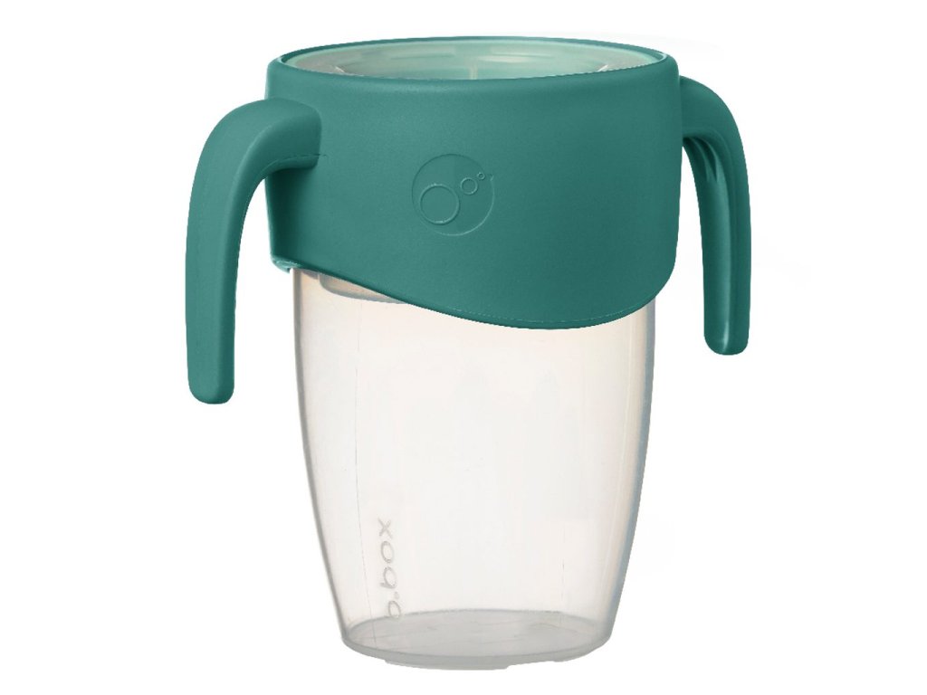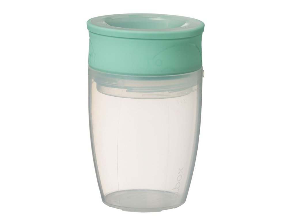 360° netečúci učiaci hrnček od značky b.box dovoľuje deťom nápoj z hrnčeka len usrkávať, ale hlavne učiť sa piť vďaka unikátnemu mäkkému silikónovému okraju po celom okraji hrnčeka.
