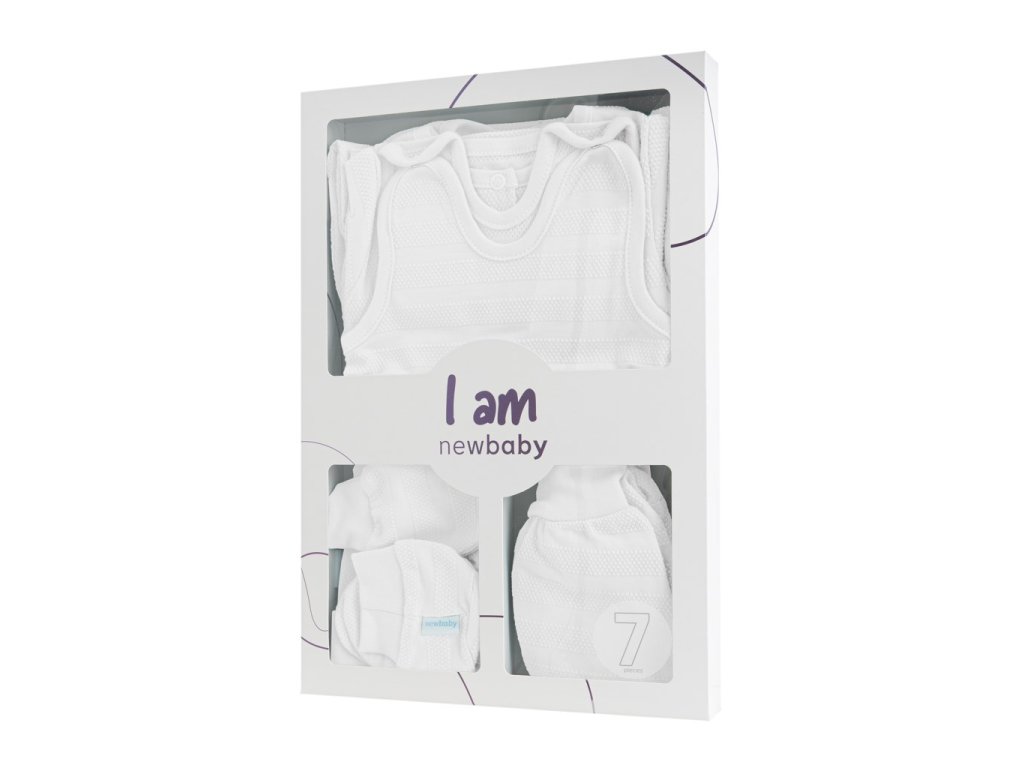 Roztomilá dojčenská 7-dielna súpravička New Baby I AM pre bábätká. Súpravička je vyrobená z veľmi príjemného, mäkkého a kvalitného materiálu, ktorý je vhodný pre bábätká a je vhodná nielen do pôrodnice. Obsahuje celorozopínacie body s dlhým rukávom, dupačky, polodupačky, kabátik, čiapočku, rukavičky a capáčky. Body má bočné zapínanie po celej dĺžke a medzi nožičkami na cvočky. Dupačky majú zapínanie na cvočky na ramienkach a medzi nožičkami, čo uľahčí obliekanie a prebaľovanie. Kabátik má zapínanie na cvočky po celej dĺžke. Čiapočka so širším lemom dobre drží na hlavičke bábätka a nepadá. Je veľmi praktická a netlačí na hlavičku bábätka. Rukavičky a capáčky majú širšiu sťahovaciu manžetku. Celá súpravička má nový neobyčajný dizajn s atraktívnym vzorom látky. Je navrhnutá s ohľadom na potreby bábätka a je vhodná aj ako milý darček. Súpravička je v praktickej Eko krabičke. Zloženie: 100% bavlna.Dodatočné parametre