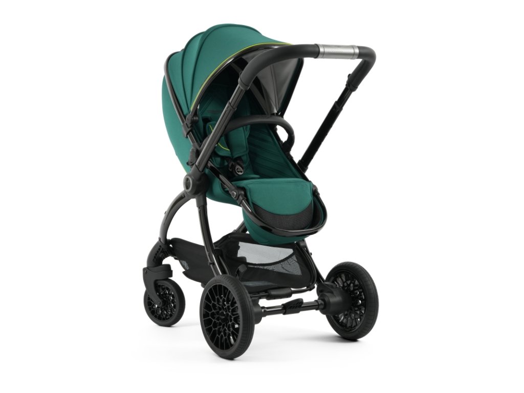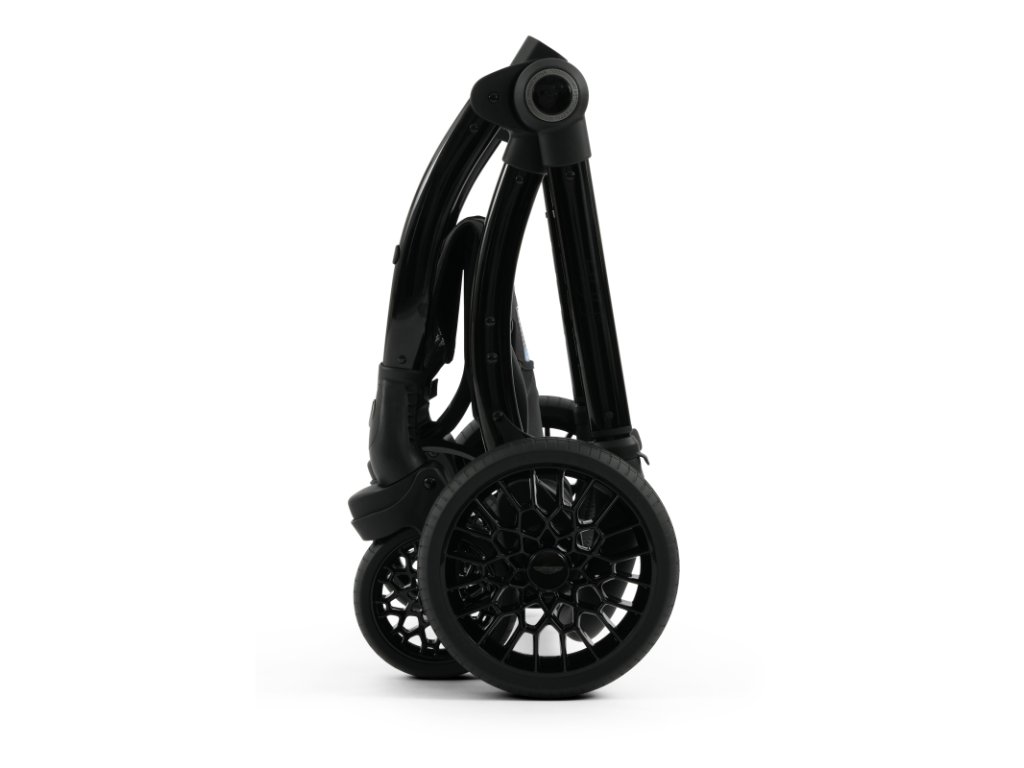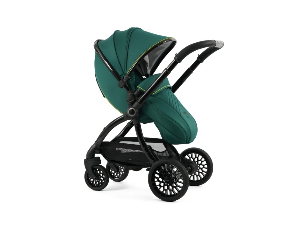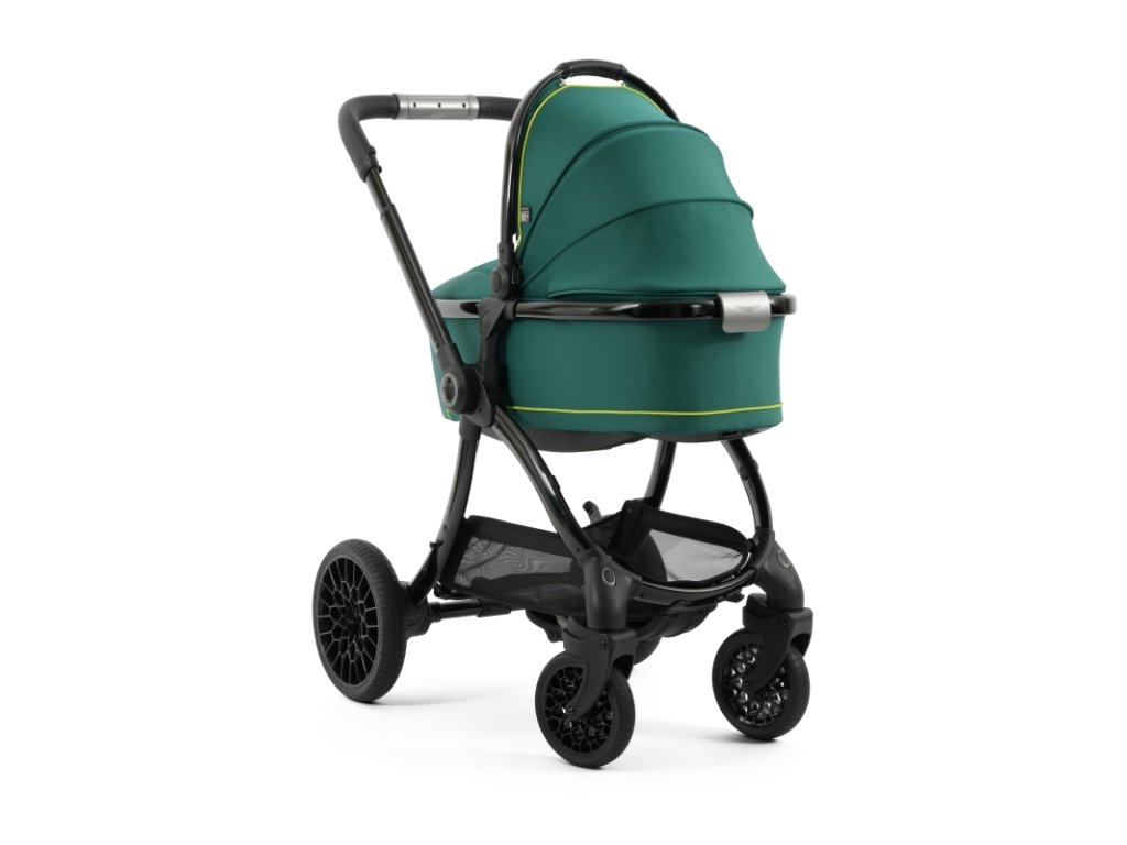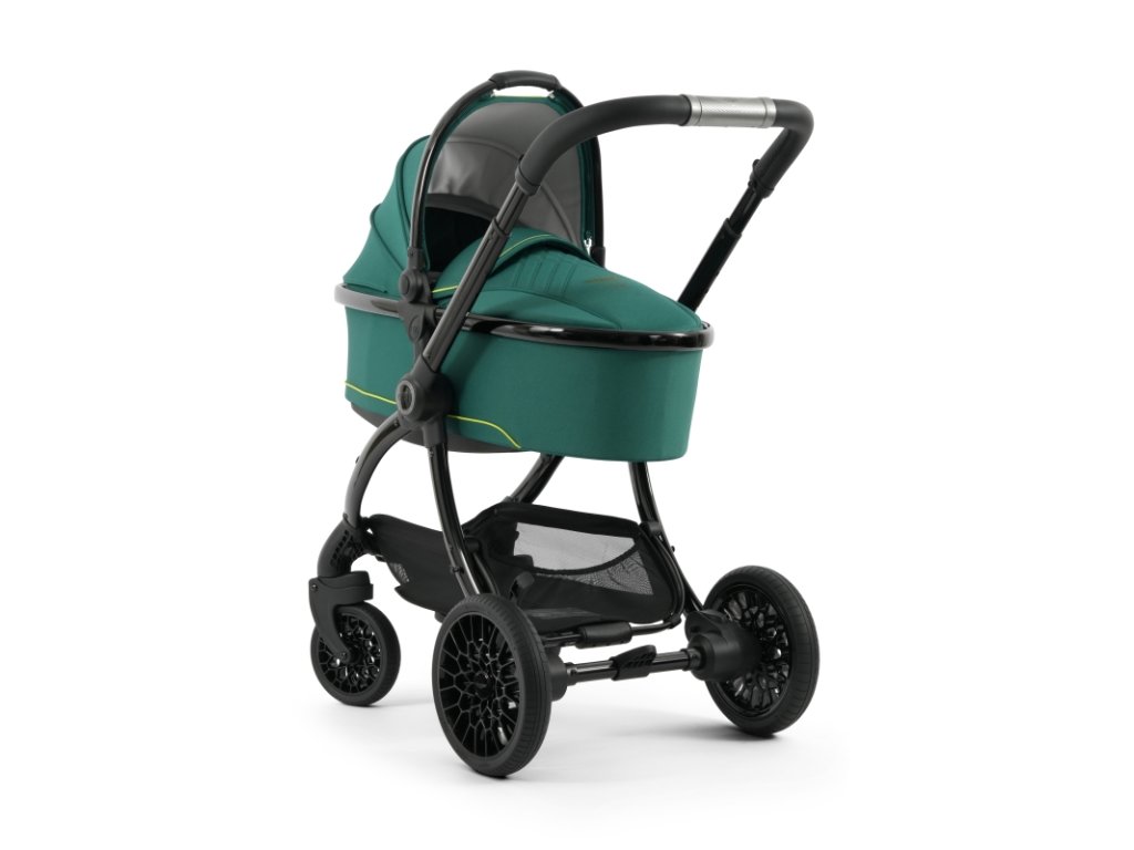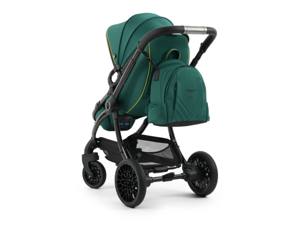 Lesklý čierny rám kočíka Aston Martin egg3® Performance Green dopĺňa elegantne prepracovaný, strieborný ryhovaný stredový kĺb, inšpirovaný ikonickými otočnými ovládacími prvkami interiérov vozidiel Aston Martin. Tento detail dodáva kočíku nádych autentickej automobilovej precíznosti. Kolesá s voštinovou štruktúrou, inšpirované modelmi Aston Martin Valour a Victor, sa dokonale snúbia s technológiou Tru-Ride®, ktorá prináša plynulú, tichú a sebaistú jazdu na každom povrchu. Celkové odpruženie, voliteľne otočné či aretovateľné predné kolesá a veľkorysý úložný košík zaisťujú praktickosť a komfort pre každodenné použitie.
