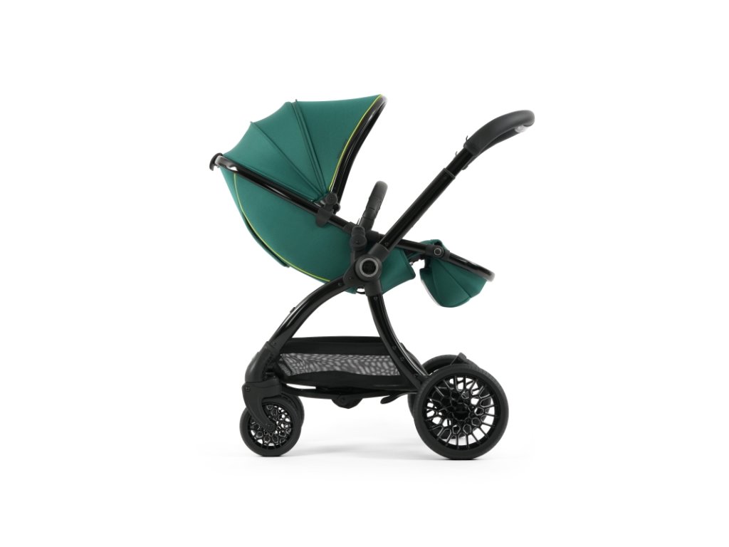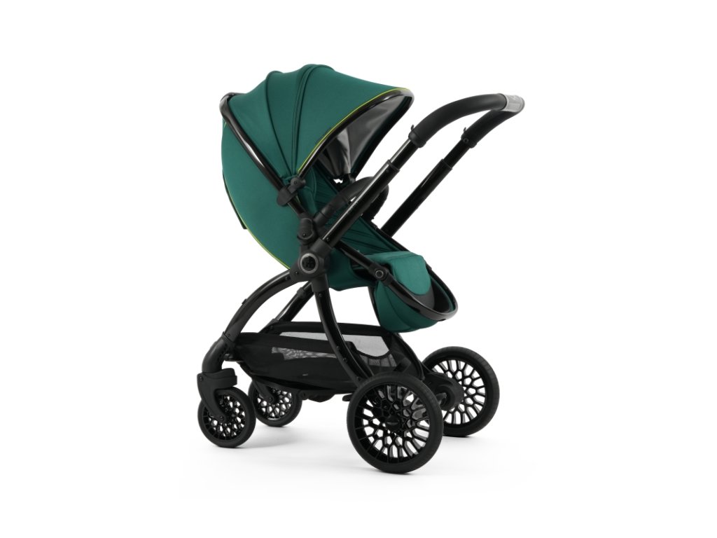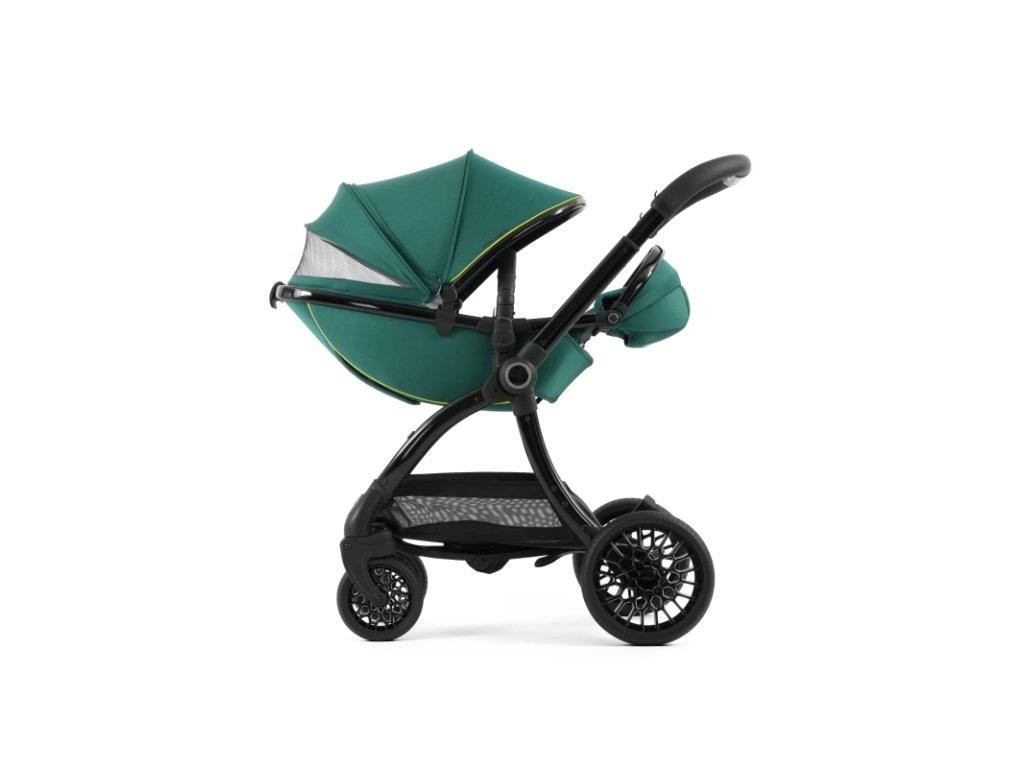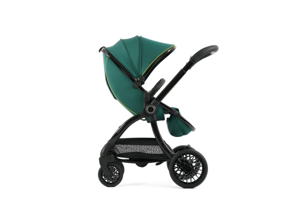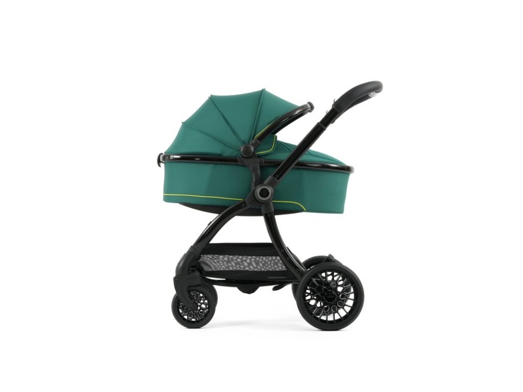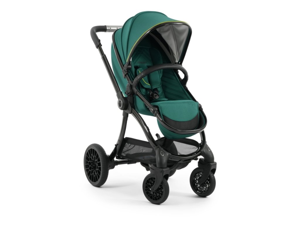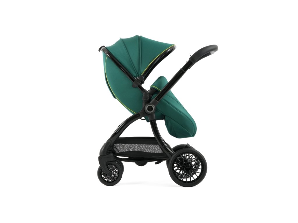 Lesklý čierny rám kočíka Aston Martin egg3® Performance Green dopĺňa elegantne prepracovaný, strieborný ryhovaný stredový kĺb, inšpirovaný ikonickými otočnými ovládacími prvkami interiérov vozidiel Aston Martin. Tento detail dodáva kočíku nádych autentickej automobilovej precíznosti. Kolesá s voštinovou štruktúrou, inšpirované modelmi Aston Martin Valour a Victor, sa dokonale snúbia s technológiou Tru-Ride®, ktorá prináša plynulú, tichú a sebaistú jazdu na každom povrchu. Celkové odpruženie, voliteľne otočné či aretovateľné predné kolesá a veľkorysý úložný košík zaisťujú praktickosť a komfort pre každodenné použitie.