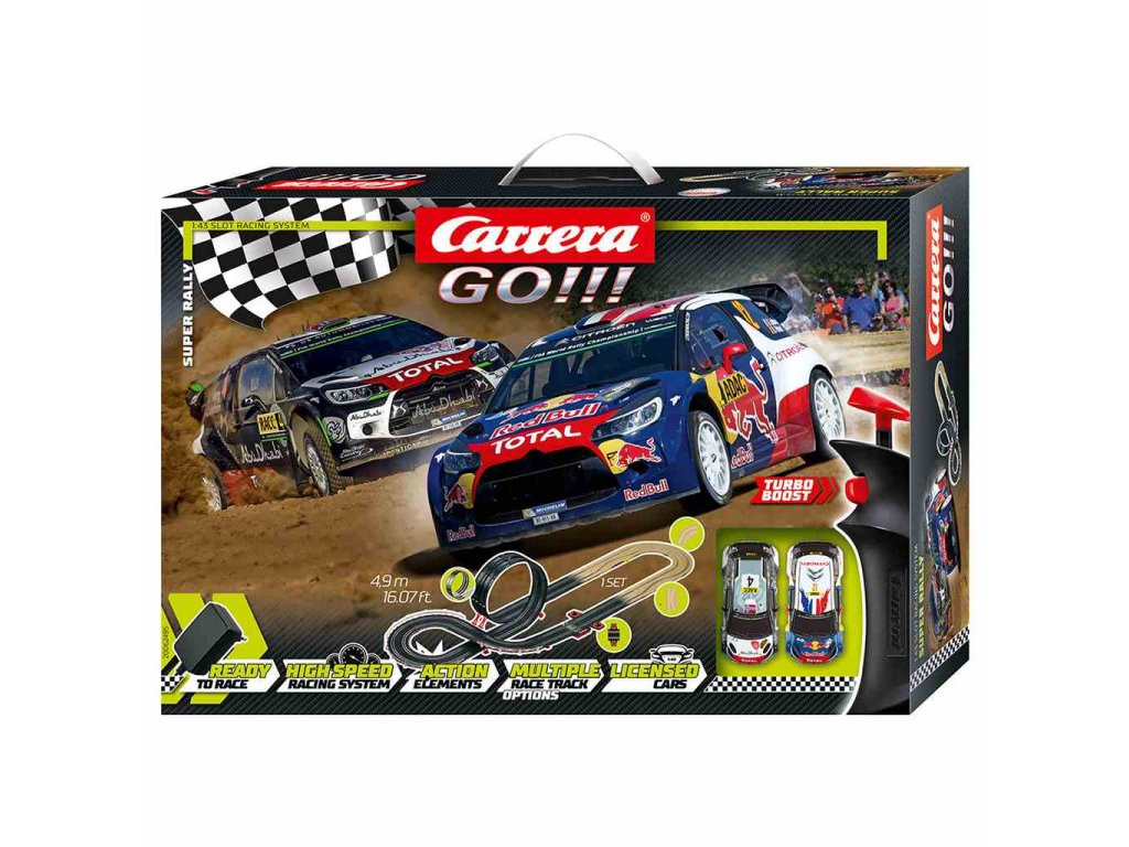 Trať Carrera Go Super Rally s dĺžkou 4,9 metra pre všetkých nadšencov automobilových pretekov. Trať ponúka funkciu turbo, slučky, zákruty a ďalšie. Prebuďte v sebe pocit nadšeného pretekára, ktorý fanúšikovia zažívajú od roku 1963, keď Carrera videla svoju prvú pretekársku trať.