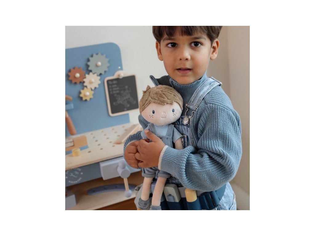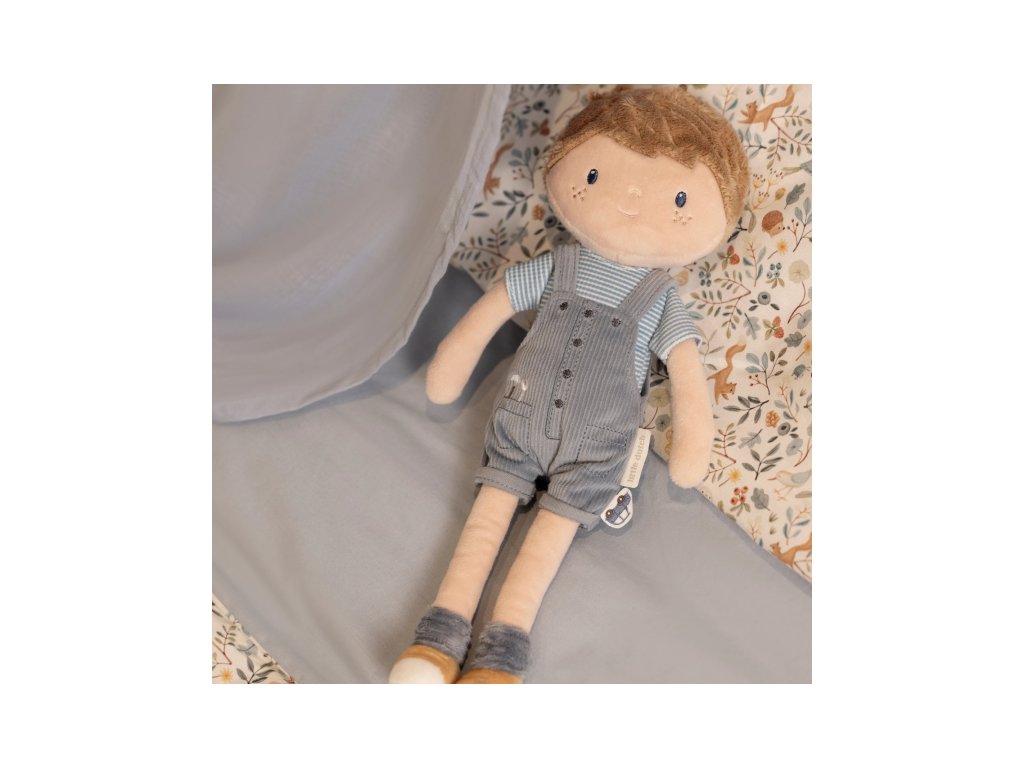Originálna plyšová bábika v podobe chlapčeka Jima v menčestrových nohaviciach s trakmi. Bábika z mäkkého jemného materiálu je ideálna ako prvá bábika pre vaše dieťa, je vhodná na hranie aj maznanie a bude sa s ňou aj krásne zaspávať!