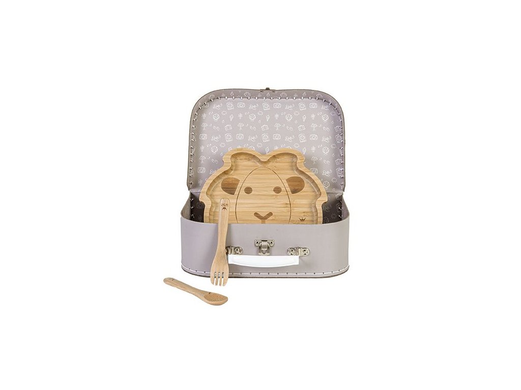 Vnútri sa skrýva bambusový tanier s prísavkou zo spodnej strany v tvare leva a bambusový príbor. Čas obeda sa stane zábavou, vďaka kufríku môžete mať veci stále pri sebe.