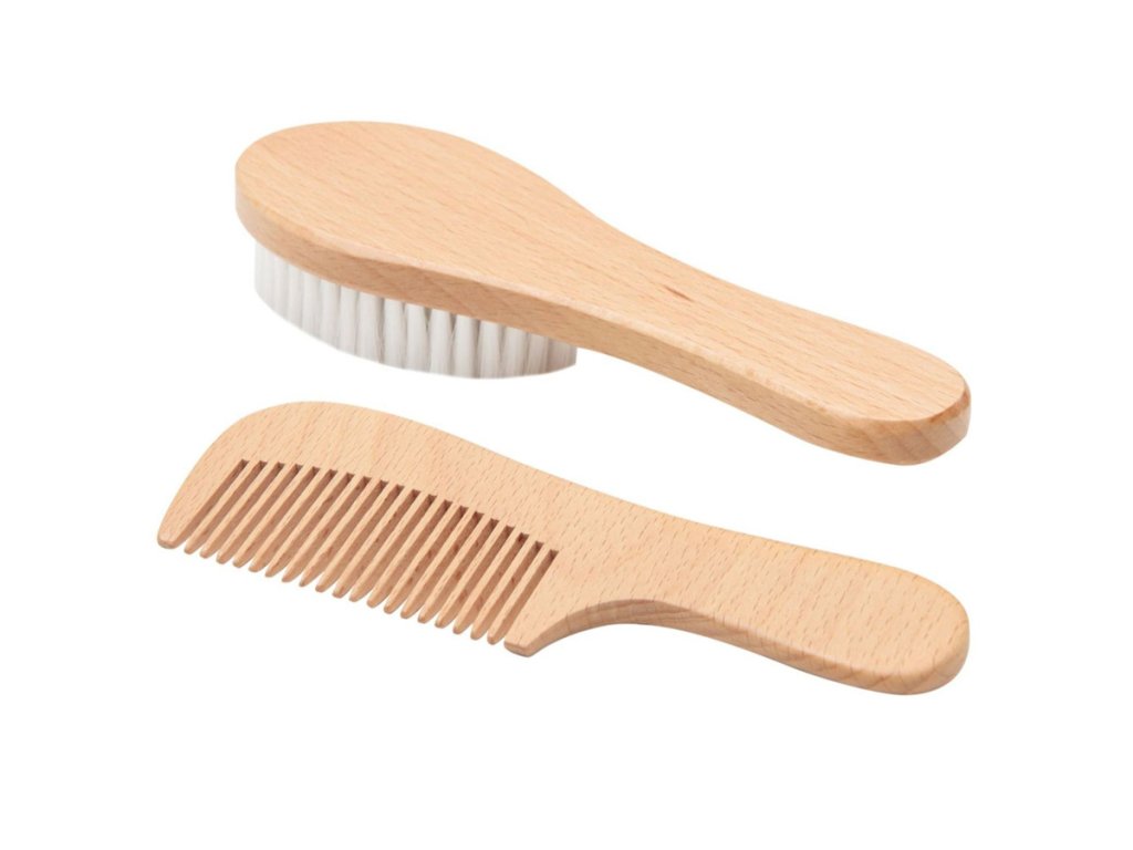 Táto štýlová a praktická sada sa skladá z hrebeňa a kefy, ktoré sú špeciálne navrhnuté pre citlivú pokožku hlavy dieťaťa. Výrobky sú vyrobené z odolného bukového dreva, ktoré je známe svojou pevnosťou a krásou. Vlas kefy je jemný k pokožke hlavy vášho dieťaťa. Vďaka tejto kombinácii prírodných materiálov a mäkkých štetín môžete jemne česať a kefovať vlásky svojho dieťatka.