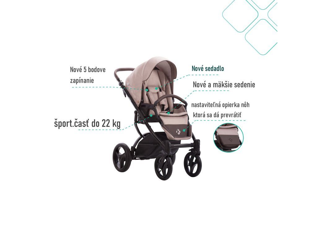 - kočík je vybavený novými odľahčenými a veľkými nízkoprofilovými nafukovacími kolesami