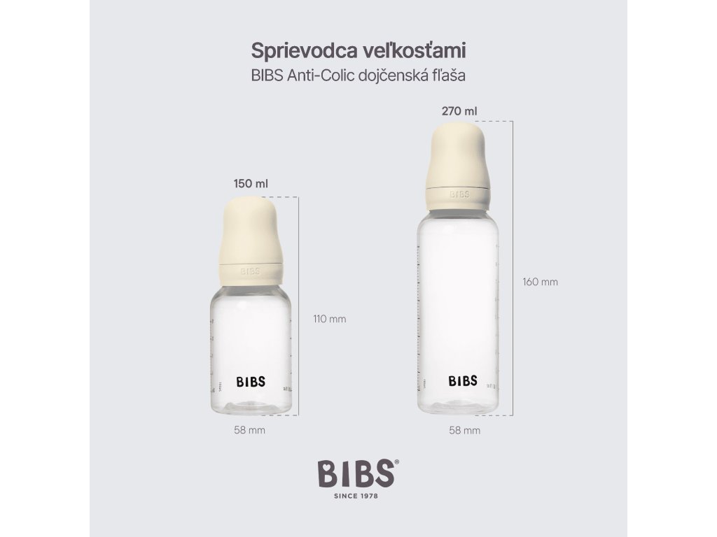 BIBS je obľúbená dánska značka s tradíciou výroby ikonických cumlíkov od roku 1978. Okrem cumlíkov BIBS ponúka aj pestrý prémiový sortiment pre najmenšie deti v minimalistickom škandinávskom dizajne a širokej farebnej palete. Rodiny si zaslúžia detskú fľašu bez kompromisov v oblasti pohodlia, bezpečnosti ale aj dizajnu. Zoznámte sa s antikolikovou dojčenskou fľašou BIBS, obľúbenou pre svoj elegantný dizajn s ocenením Red Dot Design Award. Anti-Colic dizajn – unikátny antikolikový ventil v tvare srdiečka pomáha predchádzať plynatosti, refluxu a kolike a podporuje plynulý tok mlieka pre šťastnejšie brušká. Obľúbený okrúhly tvar cumlíka pripomína tvar matkinej bradavky, podporuje podobné umiestnenie jazyka a správnu aktívnu techniku satia ako pri dojčení a tým uľahčuje striedanie dojčenia z prsníka a kŕmenia z fľaše. Prírodný kaučuk je mimoriadne pružný, jemný a mäkký ako pokožka, odolný voči vytvoreniu trhlín a odštiepeniu malých kúskov. Praktické doplnky súčasťou balenia (tesniaci disk, skladací lievik). Jednoduché čistenie - vhodné aj do umývačky riadu, mikrovlnnej rúry, mrazničky (okrem cumlíka a lievika). Vysoká kvalita – všetky komponenty sú vyrobené v Európe zo 100% potravinárskych materiálov bez BPA a iných škodlivín. 100% recyklovateľné. OBSAH BALENIA: Plastová fľaša z potravinárskeho PP bez obsahu BPA a ftalátov - 150ml alebo 270ml. Cumlík z prírodného kaučuku - pomalý prietok (150ml fľaša) alebo stredný prietok (270ml fľaša). Objímka. Vrchnák. Tesniaci disk – umiestnite pod objímku pri prenose, na cestách, do tašky, či kočíka. Skladací lievik – pre rýchle a jednoduché naplnenie fľaše. MIX&MATCH: Okrem kompletnej dojčenskej fľaše, ktorá vám poskytne všetko, čo potrebujete na pohodlné kŕmenie z fľaše (fľaša, cumlík, objímka, vrchnák, tesniaci disk a lievik), je v ponuke aj samostatná náhradná fľaša (150 ml alebo 270 ml) a samostatný set uzáverov na fľašu (objímka, vrchnák a tesniaci disk v rôznych farbách). Môžete si tak vyskladať fľašu podľa potrieb vášho dieťatka a vašich preferencií. BIBS ponúka samozrejme aj náhradné cumlíky v kaučukovom aj silikónovom prevedení, s rôznymi prietokmi (pomalý, stredný, rýchly). POUŽITIE: Pred prvým použitím sterilizujte všetky súčasti fľaše vo vriacej vode po dobu 5 minút, neskôr sterilizujte podľa potreby. Pravidelne kontrolujte cumlíky a podľa potreby ich vymeňte (cca každé 1–2 mesiace v prípade kaučuku), alebo skôr, ak sú poškodené. Cumlík nevystavujte priamemu slnečnému žiareniu ani iným zdrojom tepla. Všetky komponenty fľaše, okrem lievika a cumlíka, sú vhodné do umývačky riadu v hornom koši. Pri čistení cumlíka nepoužívajte ostré predmety. BIBS fľaše spĺňajú európsku normu EN 14350:2020.Dodatočné parametre