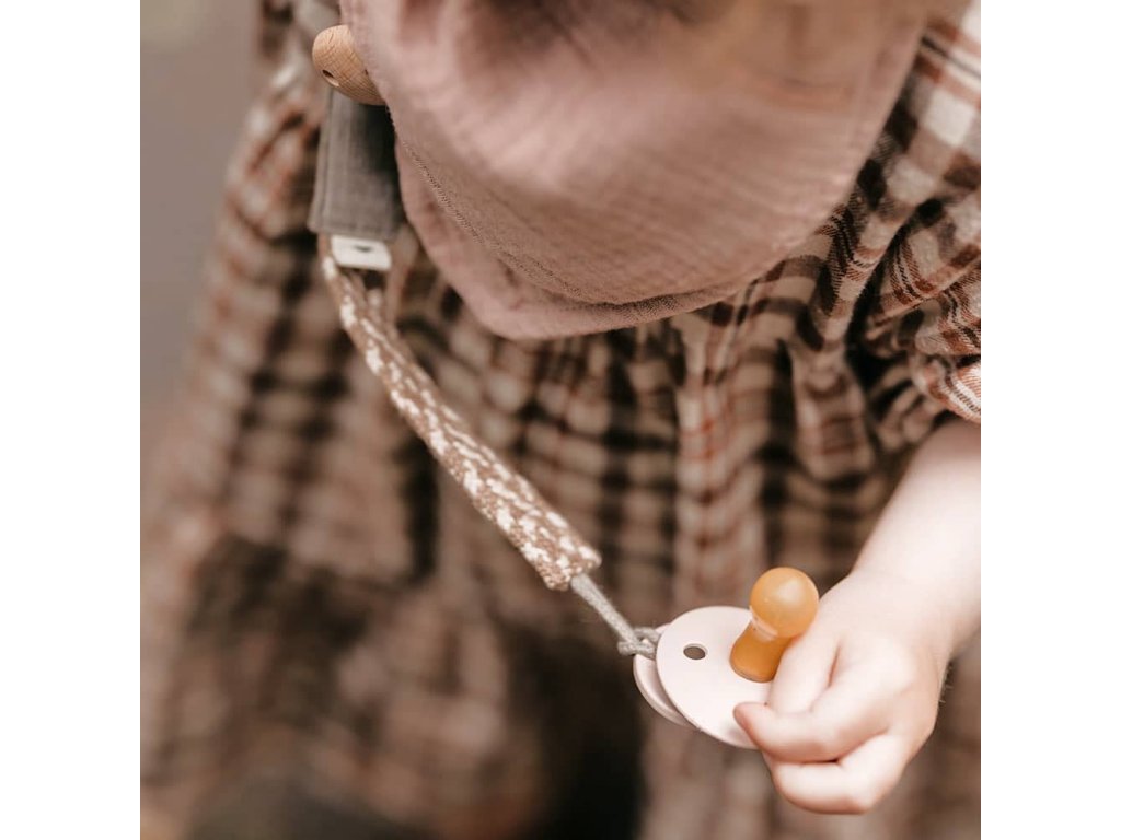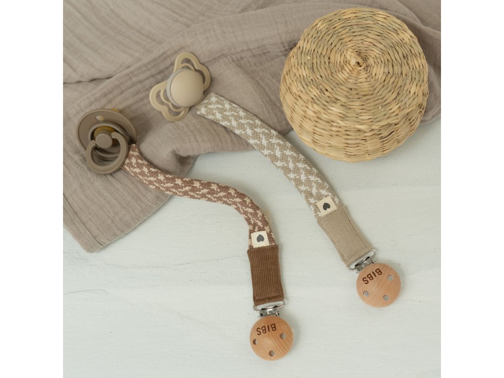 BIBS je obľúbená dánska značka s tradíciou výroby ikonických cumlíkov od roku 1978. Okrem cumlíkov BIBS ponúka aj pestrý prémiový sortiment pre najmenšie deti v minimalistickom škandinávskom dizajne a širokej farebnej palete. Všetky BIBS produkty sú garanciou najvyššej kvality detského sortimentu.Praktickou súčasťou modernej detskej výbavičky je klip na cumlíky. Svoje využitie si nájde v domácom prostredí, vonku, v autosedačke, pri hre alebo počas prechádzky a zabezpečí, že je cumlík vždy po ruke, zostane čistý, nespadne na zem alebo sa nestratí.Klipy na cumlíky BIBS Paci Braid majú klasický retro pletený dizajn so škandinávskym nádychom. Sú vyrobené zo 100% organickej bavlny. Kovová časť je bez obsahu niklu a drevený dekoračný prvok má certifikát FSC, ktorý garantuje udržateľnosť lesného hospodárstva. Klipy sú vhodné pre všetky druhy cumlíkov BIBS. Rodičia, ktorí chcú skombinovať dizajn a funkčnosť, si klipy ľahko farebne doladia s obľúbenými cumlíkmi aj so slintáčikmi BIBS Bandana.Zloženie:100% organická bavlna.FSC certifikované drevo.Kov bez obsahu niklu. Certifikáty: V súlade s európskou normou EN 12586+A1:2011. FSC – Drevo s certifikátom FSC. Značka FSC je zárukou, že sa nevyťaží viac dreva, ako dokáže produkovať samotný les a garantuje dobré pracovné podmienky. Rozmer: Celková dĺžka 22cm. Použitie:Klip na cumlík by sa mal používať, keď je vaše dieťa bdelé a pod dohľadom. Môže byť pripevnený iba k odevu. Nemal by sa používať, keď je dieťa v postieľke ani počas spánku. Nesmie sa používať ako hračka ani hryzátko. Neviažte ho okolo krku svojho dieťaťa a nepoužívajte, keď je dieťa bez dozoru. Pred každým použitím starostlivo skontrolujte. Pri prvom náznaku poškodenia alebo oslabenia vyhoďte. Nikdy nepredlžujte. Nikdy nepripínajte na stuhy, šnúrky alebo voľné časti odevu.Dodatočné parametre