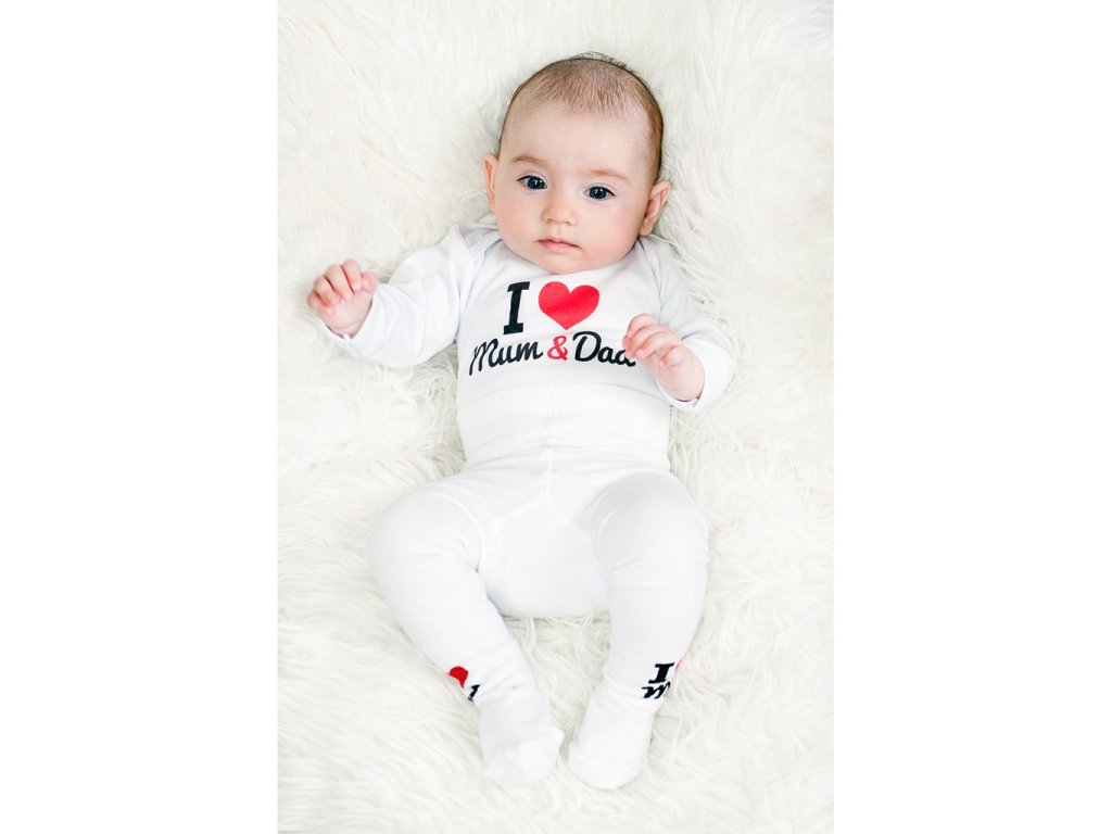Originálne bavlnené dojčenské body s dlhým rukávom New Baby, s vtipným nápisom I Love Mum and Dad. Farby použité k potlači sú certifikované a vhodné pre bábätká. Je vyrobené z príjemného a kvalitného materiálu, v ktorom sa bude Vaše bábätko cítiť príjemne. Body má zapínanie na cvočky na ramienku a medzi nožičkami, čo uľahčuje obliekanie a prebaľovanie. Doprajte Vášmu bábätku vyniknúť v originálnom body. Zloženie: 100% bavlna. Rozmery: obvod okolo hrudníka cca 46 cm, dĺžka rukáva cca 24 cm, celková dĺžka cca 40 cm.Dodatočné parametre