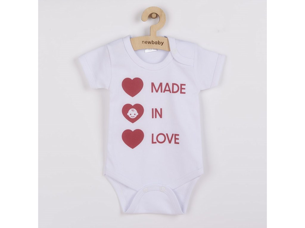 Originálne bavlnené dojčenské body s krátkym rukávom New Baby s nápisom MADE IN LOVE a obrázkom. Farby použité k potlači sú certifikované a vhodné pre bábätká. Je vyrobené z príjemného a kvalitného materiálu, v ktorom sa bude Vaše bábätko cítiť príjemne. Body má zapínanie na cvočky na ramienku a medzi nožičkami, čo uľahčuje obliekanie a prebaľovanie. Doprajte Vášmu bábätku vyniknúť v originálnom body. Zloženie: 100% bavlna.Dodatočné parametre