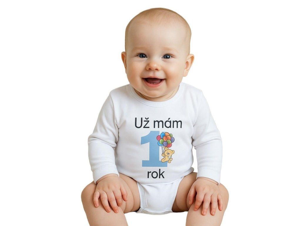 Originálne bavlnené dojčenské body s dlhým rukávom New Baby, s vtipným nápisom Už mám 1 rok a obrázkom veľkej jednotky s balónikmi. Farby použité k potlači sú certifikované a vhodné pre bábätká. Je vyrobené z príjemného a kvalitného materiálu, v ktorom sa bude Vaše bábätko cítiť príjemne. Body má zapínanie na cvočky na ramienku a medzi nožičkami, čo uľahčuje obliekanie a prebaľovanie. Doprajte Vášmu bábätku vyniknúť v originálnom body. Zloženie: 100% bavlna. Rozmery: obvod okolo hrudníka cca 50 cm, dĺžka rukáva cca 26 cm, celková dĺžka cca 42 cm.Dodatočné parametre