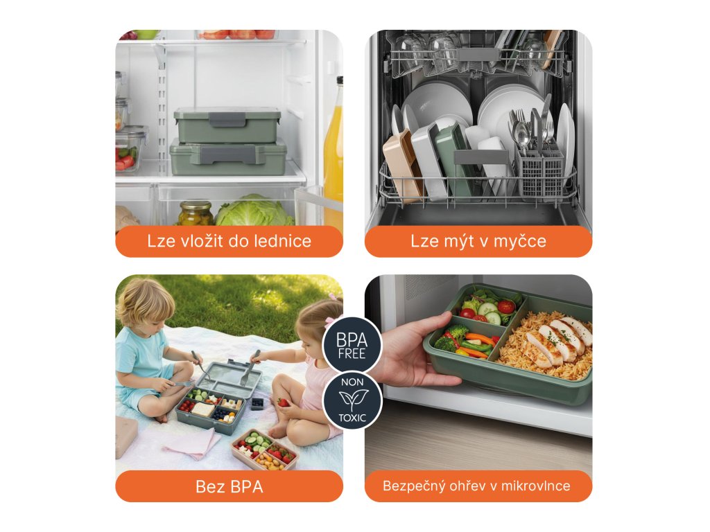 Box je vyrobený z materiálov bez BPA, je odolný voči pádu a môžete ho bez obáv umývať v umývačke, použiť v mikrovlnnej rúre alebo uložiť do mrazničky.