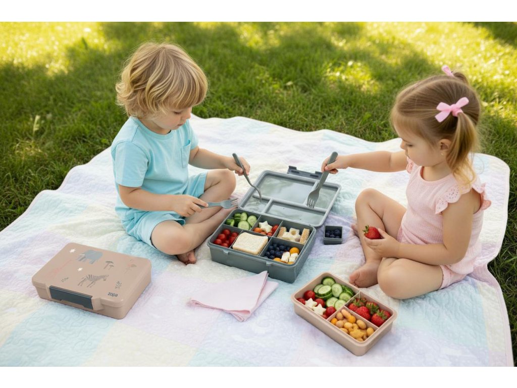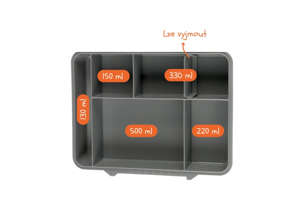 Vďaka viacerým priestranným priehradkám rôznych veľkostí (500 ml, 330 ml, 220 ml, 150 ml a 130 ml) môžete pripraviť pestrý a vyvážený obed so sebou. Malá nádobka na omáčku a integrovaná vidlička s lyžičkou sú samozrejmosťou.