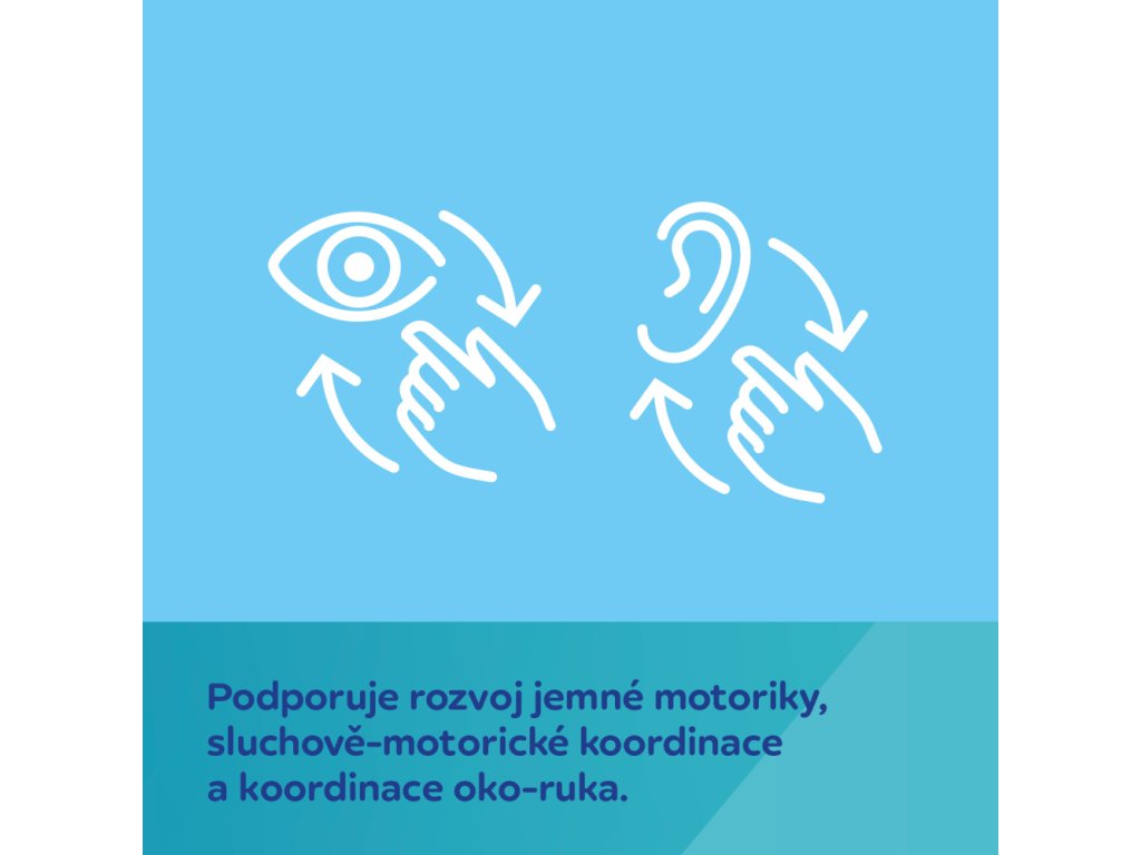 - Podporuje rozvoj koordinácie oko-ruka, sluchovo motorickej koordinácie a jemnej motoriky.