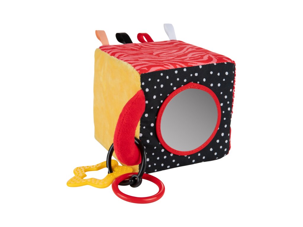 Mäkká kontrastná kocka z kolekcie BabiesBoo má mnoho senzorických prvkov, ktoré povzbudzujú k hre a podporujú rozvoj zmyslov od prvých okamihov života: zrak, sluch a hmat. Šuštiace prvky, hryzačka, zrkadlo alebo jemne zvoniaca hrkálka sú pre dieťa zaujímavé pri prvom objavovaní sveta. Mäkká senzorická kocka v kontrastných farbách, ktoré novorodenci vidia ako prví, podporuje správny vývoj zraku dieťaťa. Univerzálny krúžok umožňuje pripevniť hračku na postieľku, kočík, hojdacie kreslo alebo autosedačku. Senzorická kocka tak poskytne vášmu dieťatku zábavu doma, na prechádzke alebo na cestách. Hračka je vyrobená z mäkkých a na dotyk príjemných materiálov tak, aby rozmanitosť textúr stimulovala rozvoj zmyslov vášho dieťatka. Kocka má vrecko, do ktorého si dieťatko môže schovať hryzátko pripevnené na stuhe a tým aj precvičiť manuálnu zručnosť. Flexibilné hryzátko poskytne vášmu dieťatku úľavu v období prerezávania zúbkov, masíruje ďasná a upokojujú svrbenie spôsobené prerezávaním prvých zúbkov. Hračka pre prvé týždne života vášho bábätka odporúčaná fyzioterapeutom. Kontrastná kocka pre bábätká je skvelý spôsob, ako sa hrať poležiačky na brušku, podporuje rozvoj sluchovej a pohybovej koordinácie a tiež precvičuje zrakové, hmatové a motorické vnímanie u dieťatka. Ideálne pre deti od prvých okamihov života.Vlastnosti: