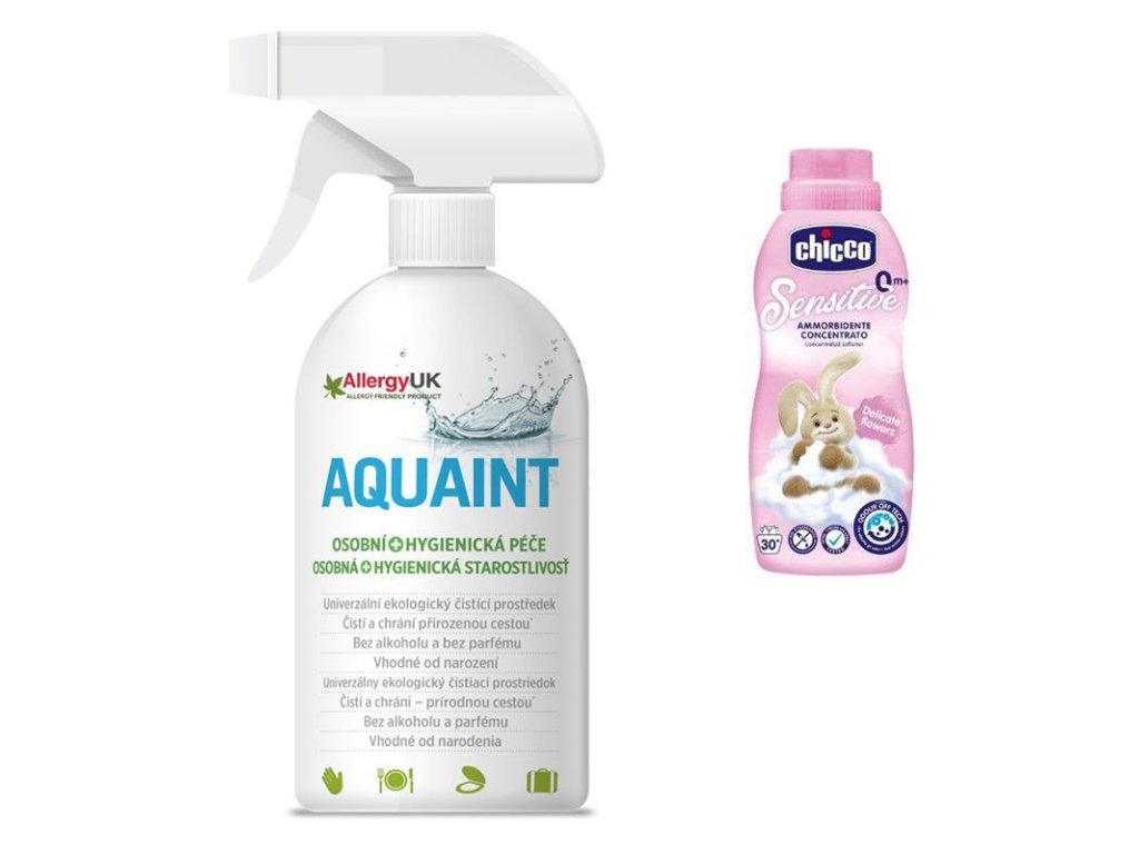 AQUAINT 100% ekologická čistiaca voda 500ml + CHICCO Aviváž Chicco koncentrovaná Kvetinové objatie, 750mlChicco aviváž osviežuje a zjemňuje všetky detské vecičky bábätka bez podráždenia jeho citlivej pokožky.