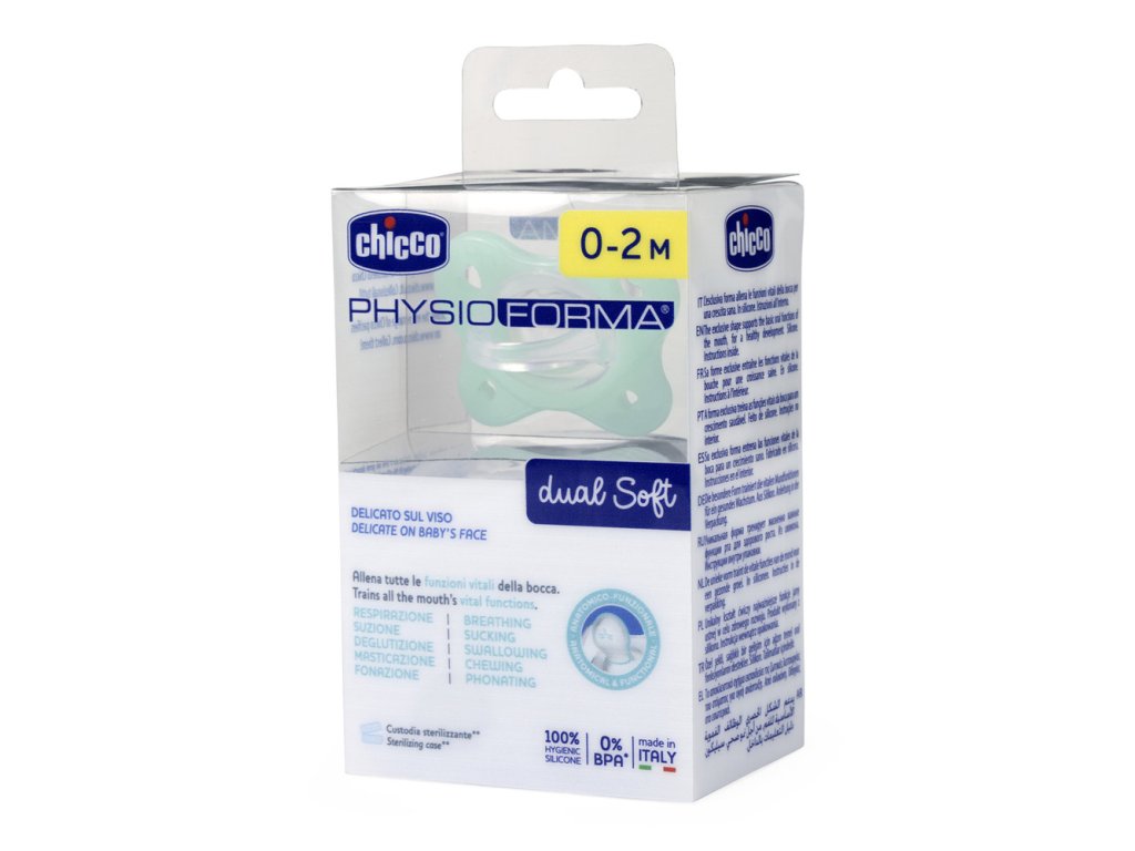 Všetky cumlíky Chicco sú PhysioForma: PhysioForma je anatomický a funkčný dizajn cumlíkov Chicco, ktorý podporuje a správne stimuluje funkcie úst a zároveň zachováva fyziologickú polohu jazyka.