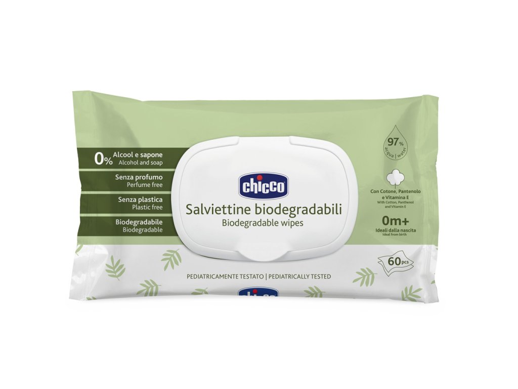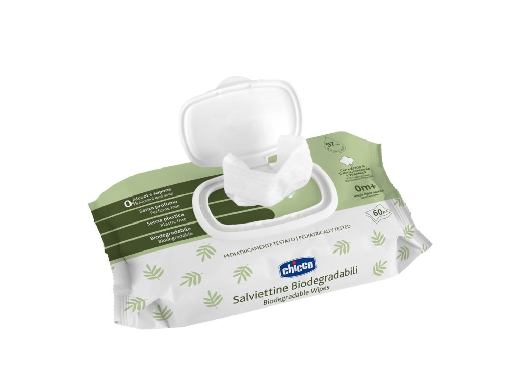 Vlhčené obrúsky Chicco sú vyrobené zo 100 % biologicky odbúrateľných prírodných vlákien a sú ideálne pri výmene plienok aj na čistenie rúk a tváre dieťatka.Zloženie bez alkoholu a mydla je obohatené o pantenol, vitamín E a extrakt z bavlny.