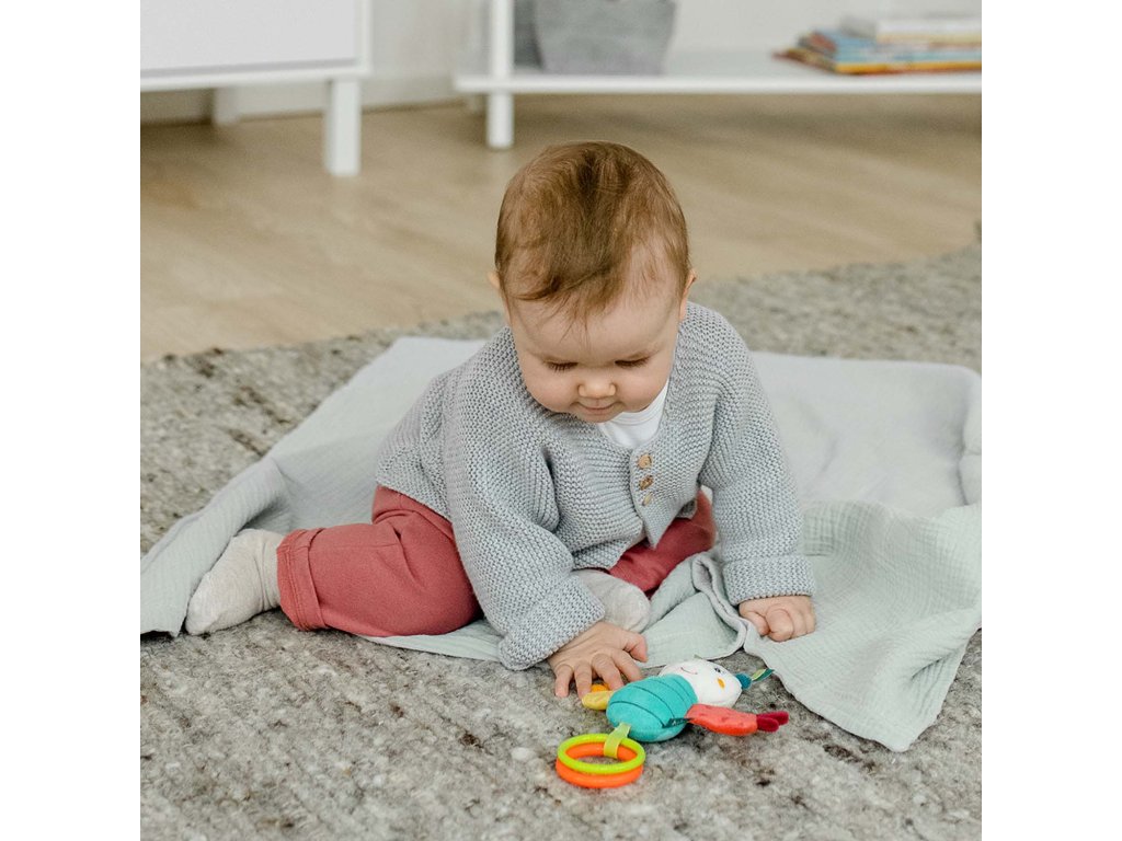 Plyšová hrkálka s množstvom aktivity prvkov ako je úchopový krúžok, hrkálka, pískací mechanizmus a škrípavý papier. Hračka na uchopenie hravo podporuje sluch dieťaťa, zmysel pre zrak, hmat, zdravé uchopenie – ideálny ako darček pre chlapcov a dievčatá k narodeniu, narodeninám či krstu.