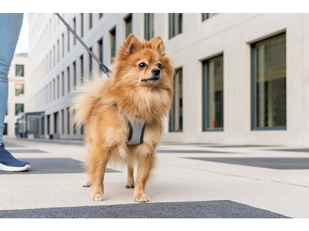 Pre bezpečnosť v tme.Ľahký, pohodlný postroj pre malých a stredne veľkých psov. Vodítko a postroj sa dajú pripnúť jednou rukou pomocou spony. Táto spona eliminuje „cvakavý“ zvuk D-krúžkov. Výrazne zlepšená ergonómia postroju a optimalizované nosenie vďaka novému vzoru a novej veľkostnej stupnici. Možnosť nastavenia veľkosti postroja pomocou suchého zipsu. Postroj je vyrobený tak, aby došlo k optimálnemu rozloženiu napätia a aby nedochádzalo k poraneniu krku. Polstrovaná pracka zabezpečuje, aby sa srsť nezachytávala ani nedráždila.