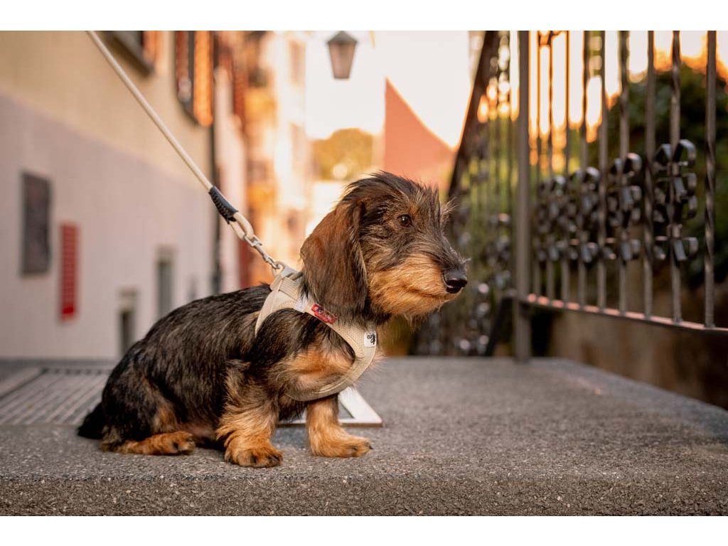 Ľahký, pohodlný postroj pre malých a stredne veľkých psov. Vodítko a postroj sa dajú pripnúť jednou rukou pomocou spony. Vysokopevný materiál spony, ktorý vydrží ťahové zaťaženie až do 100 kg. Táto spona eliminuje „cvakavý“ zvuk D-krúžkov. Výrazne zlepšená ergonómia postroju a optimalizované nosenie vďaka novému vzoru a novej veľkostnej stupnici.Postroj je vyrobený z ľahkého vzdušného materiálu Air-Mesh pre pohodlné nosenie. Možnosť nastavenia veľkosti postroja pomocou suchého zipsu. Postroj je vyrobený tak, aby došlo k optimálnemu rozloženiu napätia a aby nedochádzalo k poraneniu krku. Polstrovaná pracka zabezpečuje, aby sa srsť nezachytávala ani nedráždila.