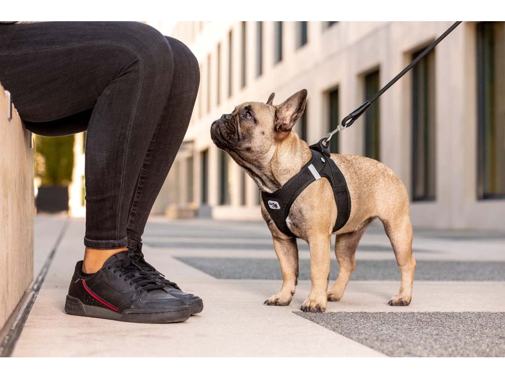 Ľahký, pohodlný postroj pre malých a stredne veľkých psov. Vodítko a postroj sa dajú pripnúť jednou rukou pomocou spony. Vysokopevný materiál spony, ktorý vydrží ťahové zaťaženie až do 100 kg. Táto spona eliminuje „cvakavý“ zvuk D-krúžkov. Výrazne zlepšená ergonómia postroju a optimalizované nosenie vďaka novému vzoru a novej veľkostnej stupnici.Postroj je vyrobený z ľahkého vzdušného materiálu Air-Mesh pre pohodlné nosenie. Možnosť nastavenia veľkosti postroja pomocou suchého zipsu. Postroj je vyrobený tak, aby došlo k optimálnemu rozloženiu napätia a aby nedochádzalo k poraneniu krku. Polstrovaná pracka zabezpečuje, aby sa srsť nezachytávala ani nedráždila.