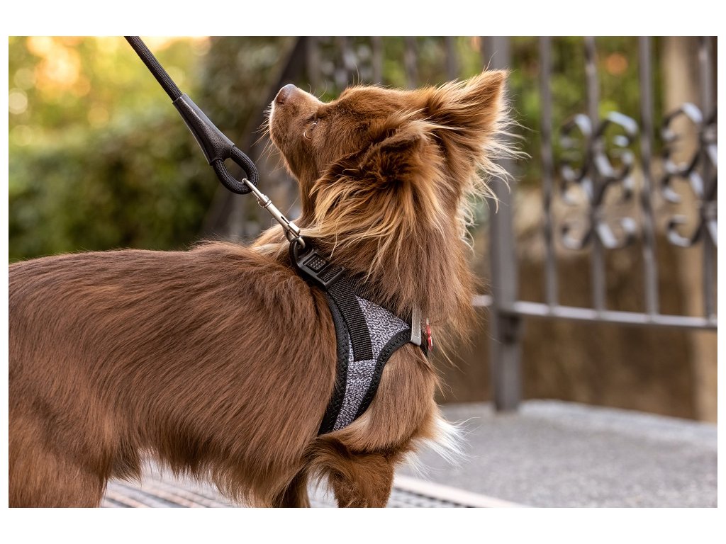- Postroj vylepšený o praktickú sponu, vďaka ktorej sa vodítko a postroj dajú pripnúť jednou rukou