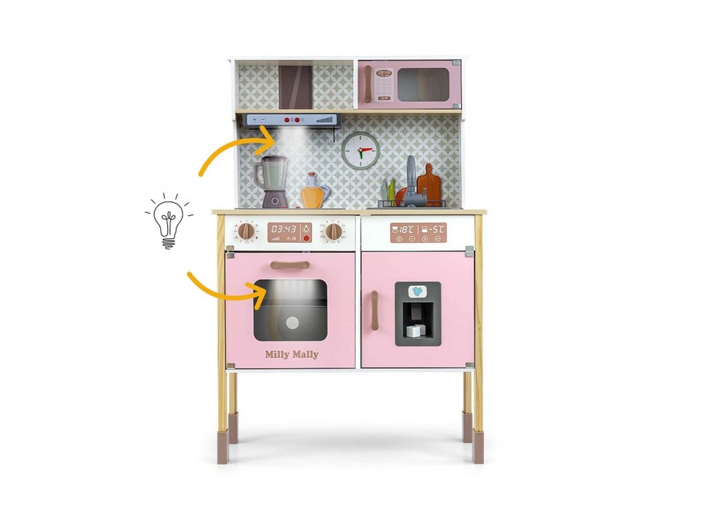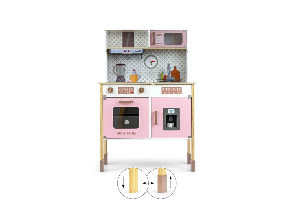 Milly Mally stavilo na bohaté vybavenie, ktoré zahŕňa panvicu, hrniec s pokrievkou a drevené špachtle na zavesenie pod digestorom. Deti sa pomocou tejto hračky učia zodpovednosti za vlastnú kuchyňu a upratovanie pri hre. Kuchynka je výškovo nastaviteľná, čo znamená, že rastie spolu s dieťaťom.