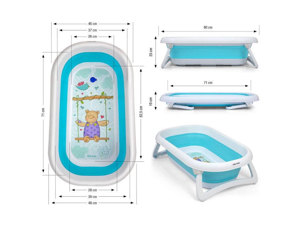 Detská skladacia vanička Milly Mally AQUA je praktickým a univerzálnym riešením do každej domácnosti bez ohľadu na veľkosť kúpeľne. Stačí zložiť nohy a potom silikónové dno. Je mimoriadne kompaktná a pohodlná. Produkt je kombináciou funkčnosti a moderného designu. Je ľahká, odolná a vďaka protišmykovým skladacím nohám predovšetkým stabilná. Boky vaničky sú vyrobené z mäkkého a na dotyk veľmi príjemného plastu a sú pre dieťa úplne bezpečné, nespôsobujú alergie a ľahko sa udržujú v čistote. Silikónové dno vaničky je vybavené dômyselnou termo citlivou zátkou, ktorá mení farbu podľa teploty vody (po prekročení 37°C sa farba zátky zmení). Pri teplote vody nad 41°C je zátka úplne priehľadná. Nezabudnite pred kúpaním vždy skontrolovať teplotu vody.