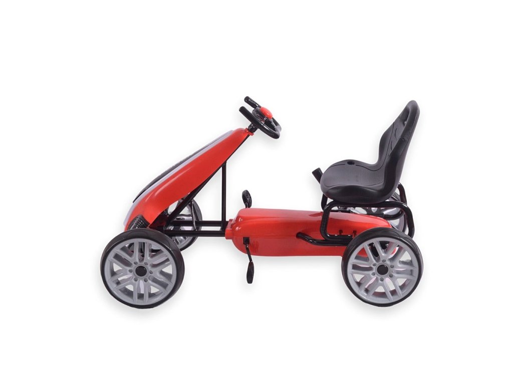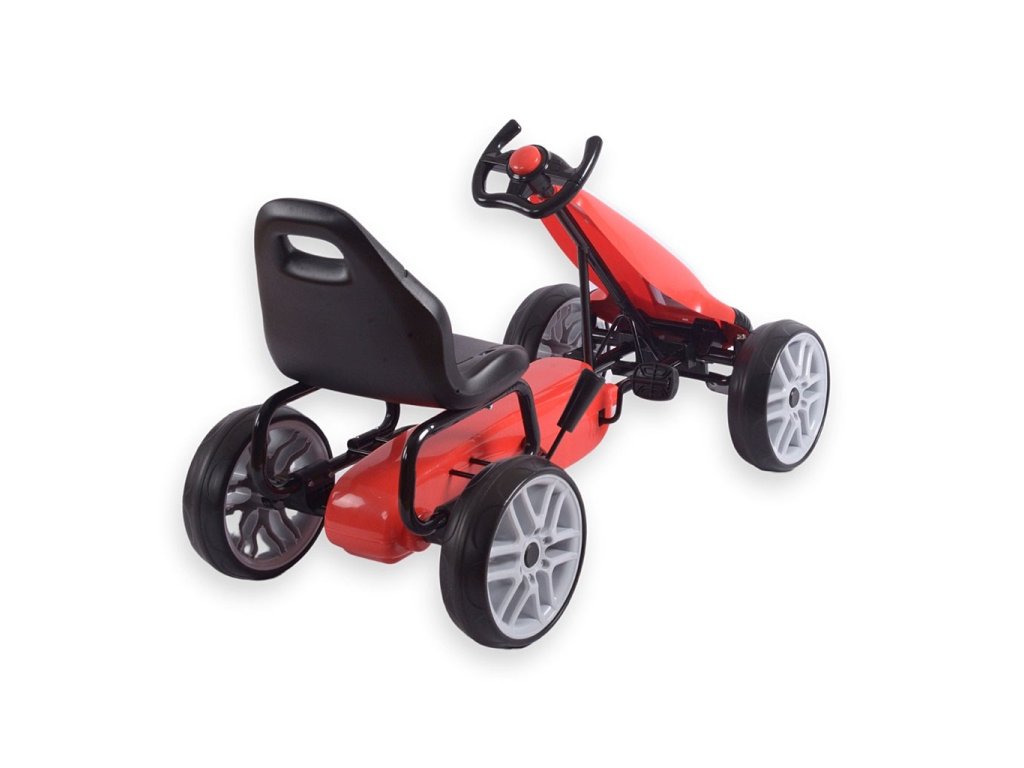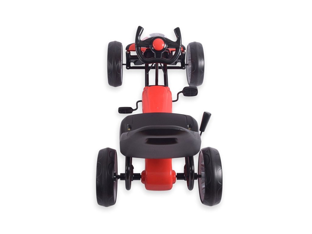 Vozidlo je vyrobené z ľahkej kovovej konštrukcie a vysokokvalitných plastov, ktoré zabezpečujú trvanlivosť a odolnosť proti poškodeniu. Má zabudovaný reťazový pohon s pedálmi a veľké, odolné kolesá s penovými pneumatikami (EVA) pre dobrú priľnavosť a pohodlie na rôznych povrchoch. Ergonomické športové riadidlá umožňujú pevné uchopenie a ľahké riadenie, zatiaľ čo tvarované sedadlo poskytuje pohodlnú jazdu. Je tiež vybavený ručnou záchrannou brzdou.