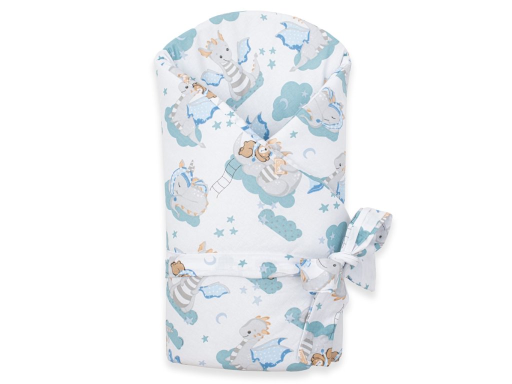 Nádherná detská zavinovačka New Baby Dráčik pre bábätká. Zavinovačka je vyrobená z kvalitného a jemného materiálu, ktorý zaručí vášmu bábätku príjemné teplo. Výplň je až 3 cm čo znamená, že zavinovačka je vhodná aj na chladnejšie dni a je dostatočne pevná. Krásny detský motív, polahodí detským očičkám. Zapínanie na suchý zips aj stuhu na zaviazanie na mašľu.Rozmery cca 80x80cm.