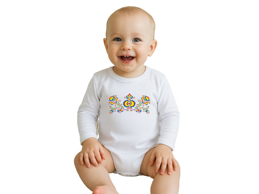 Originálne, štýlové a pohodlné detské body s nádhernou folklórnou potlačou New Baby, dokonale spája tradíciu s moderným dizajnom. Ideálna voľba pre malých milovníkov ľudovej tradície, ktorí ocenia kvalitné materiály a jedinečný vzhľad. Folklórny vzor inšpirovaný tradičnými motívmi dodá vášmu dieťatku šmrnc.