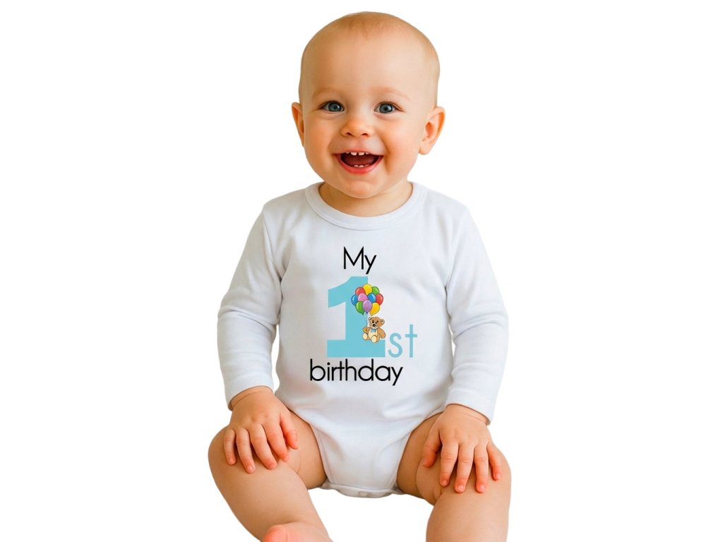 Detské body s potlačou New Baby My first birthday blue, veľkosť 86 (12-18m)