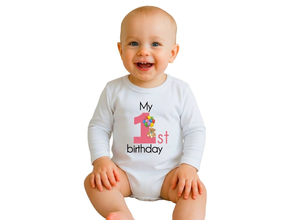 Detské body s potlačou New Baby My first birthday pink, veľkosť 86 (12-18m)