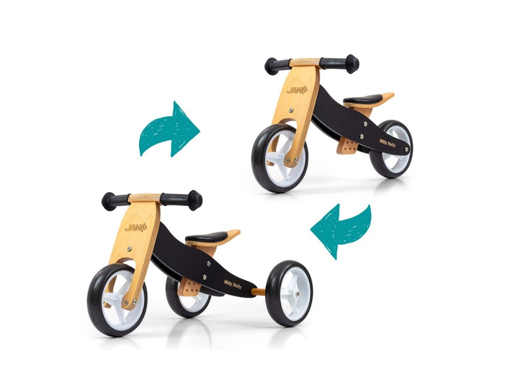Detské multifunkčné drevené odrážadlo Milly Mally JAKE je ideálne pre deti, ktoré sa práve začínajú učí jazdiť na bicykli a pritom nie sú schopné udržať rovnováhu na dvoch kolesách. Výhodou odrážadlá JAKE je, že z trojkolky sa ľahko stane odrážadlo na dvoch kolesách.Charakteristika: