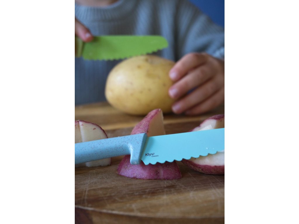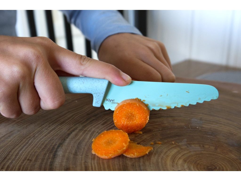 KLYV Classic podporuje rozvoj jemnej aj hrubej motoriky, zlepšuje koordináciu ruka–oko a posilňuje úchop aj kontrolu pohybu. Umožňuje deťom bezpečne a samostatne krájať ovocie, zeleninu či ďalšie suroviny a prirodzene ich vedie k zodpovednosti a zdravým stravovacím návykom. Vďaka ergonomickému tvaru nôž dobre padne do ruky, je vhodný pre pravákov aj ľavákov a podporuje správne vedenie pohybu pri krájaní.