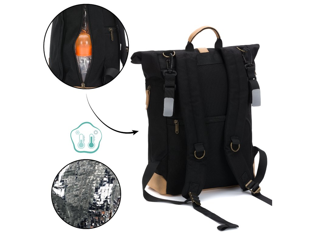 Po stranách batohu jsou dvě kapsy na lahve až do objemu 0,5 l. Jedna z nich je navíc vybavena termoizolační vrstvou, která udrží kojeneckou lahev déle teplou, případně později nápoj pro maminku či tatínka chladný.