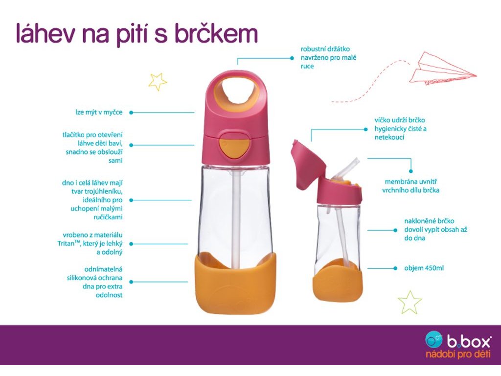 Už sú veľkí na hrnček so slamkou a hľadáte ľahkú fľašu pre celodennú hydratáciu detí? Obľúbená austrálska značka b.box má pre nich bezchybnú fľaštičku! Do škôlky aj do školy, na ihrisko aj na výlety, tritánovú fľaštičku môžete mať všade so sebou.