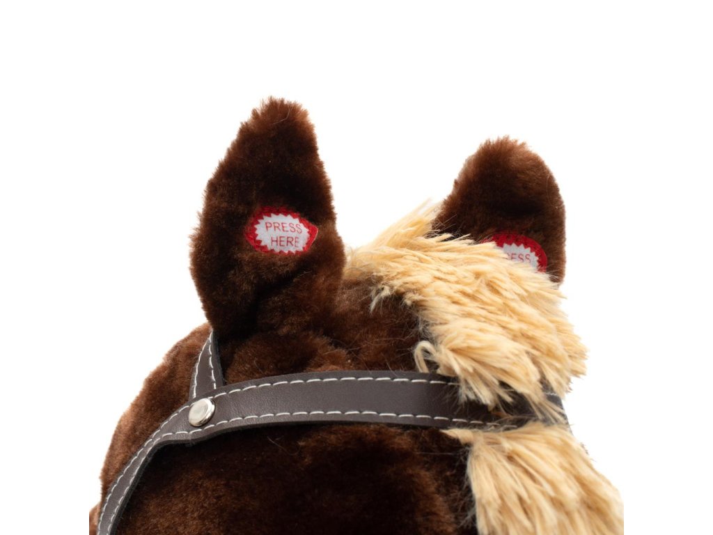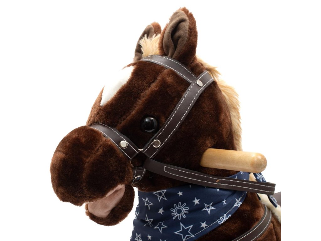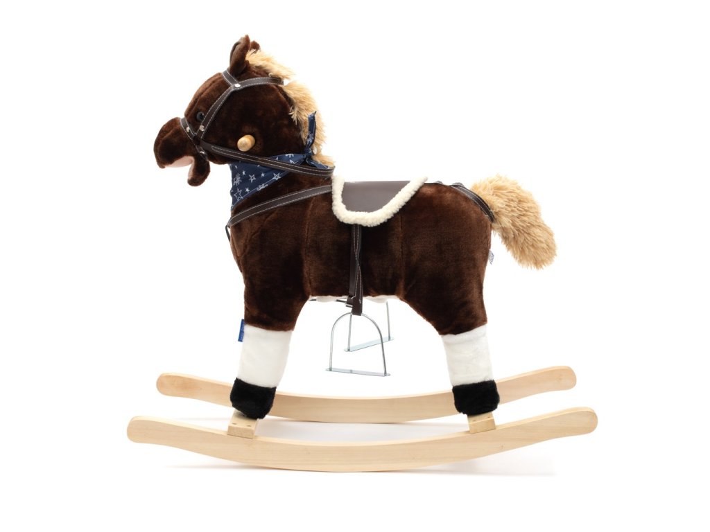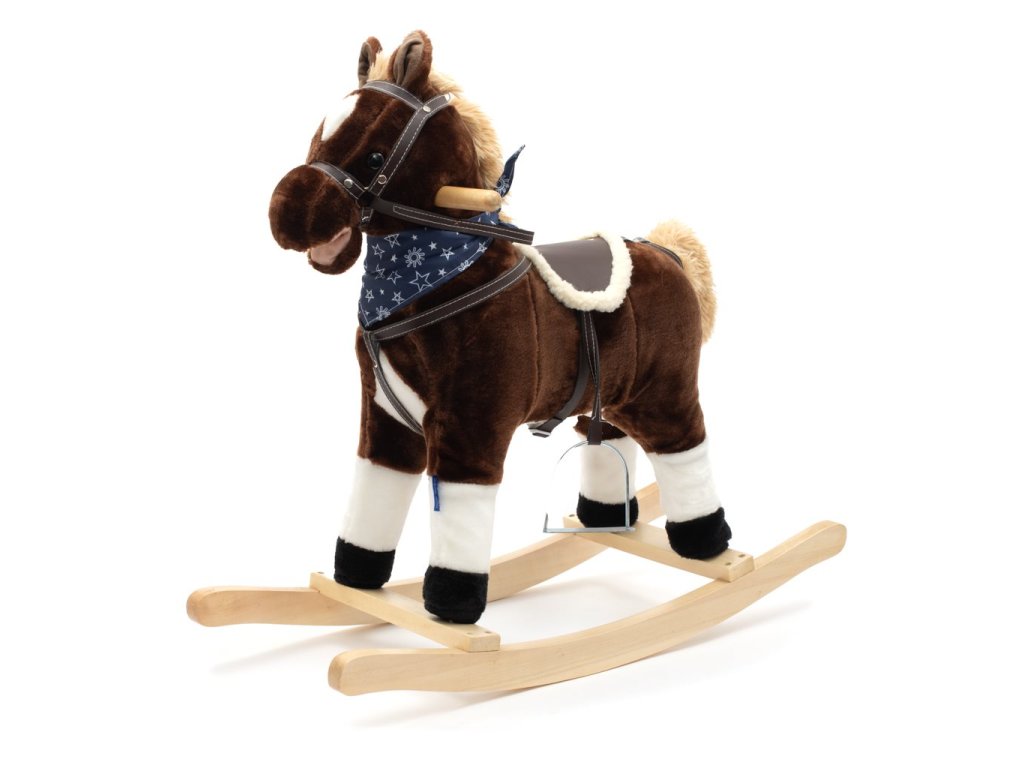 Mäkučký hojdací koník Baby Mix bol navrhnutý pre deti, ktoré majú rady dobrodružstvo. Vyzerá ako skutočný, takže sa vaše dieťa bude cítiť ako skutočný jazdec. Koník je vyrobený z mäkkého plyšu, okolo krku má ozdobnú šatku a je vybavený drevenými hojdacími lištami, ktorých profil chráni dieťa pred prevrátením. Pohodlné sedlo, pevná uzda, kovové strmene, drevené rukoväte a stabilné hojdacie lišty zaistia vašim kovbojom ešte väčšiu stabilitu a pohodlie počas hojdania. Je vyrobený z mäkkého plyšového materiálu, pevné drevené lišty alebo rukoväte je možné ľahko odskrutkovať. Po stlačení tlačidiel na uškách koník vrtí chvostíkom, hýbe tlamičkou, ozvú sa zvuky cvalu, koník zaerdží a zaspieva kovbojskú pesničku. Tri potrebné batérie AA 1,5 V sa vkladajú do púzdra umiestneného na brušku koníka a nie sú súčasťou balenia. Počas hojdania sa dieťa učí koordinovať pohyby svojho tela s koníkom, čo zlepšuje celkovú rovnováhu a motoriku dieťaťa.