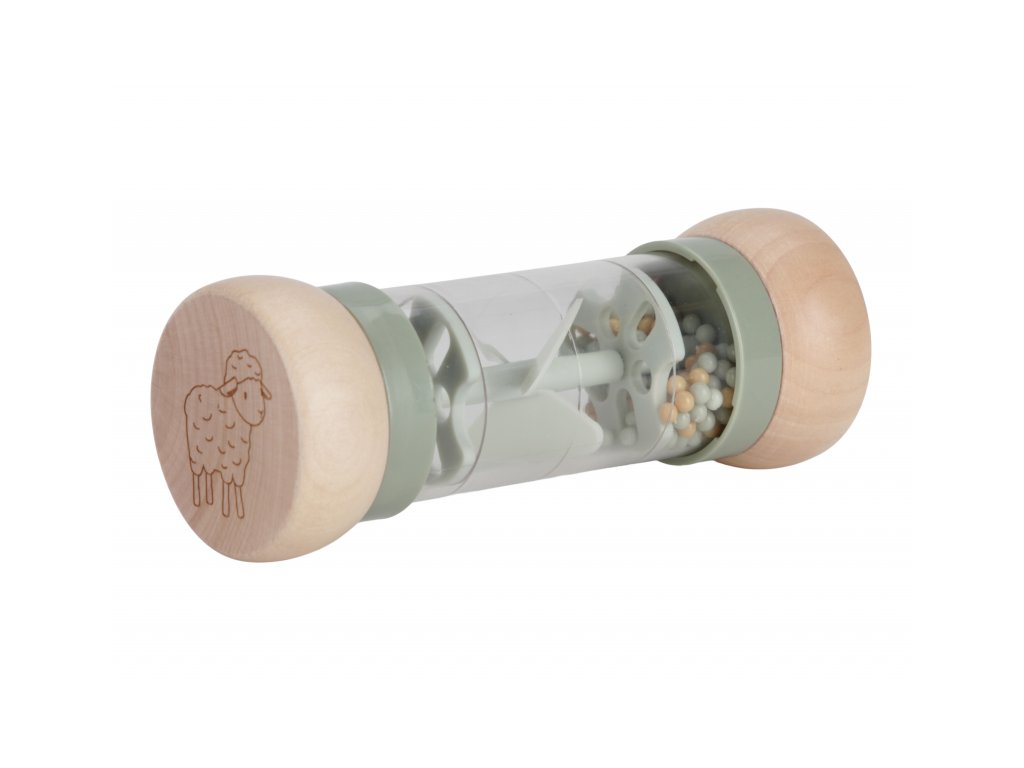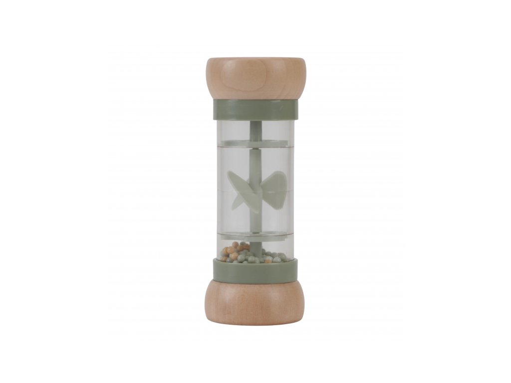 Hrkálka v krásnom prevedení v kombinácii dreva a plastu. Korálky aj otočná vrtuľa vo vnútri hrkálky pri pohybe jemne hrkajú. Tvar hračky umožňuje ľahké uchopenie detskými ručičkami.