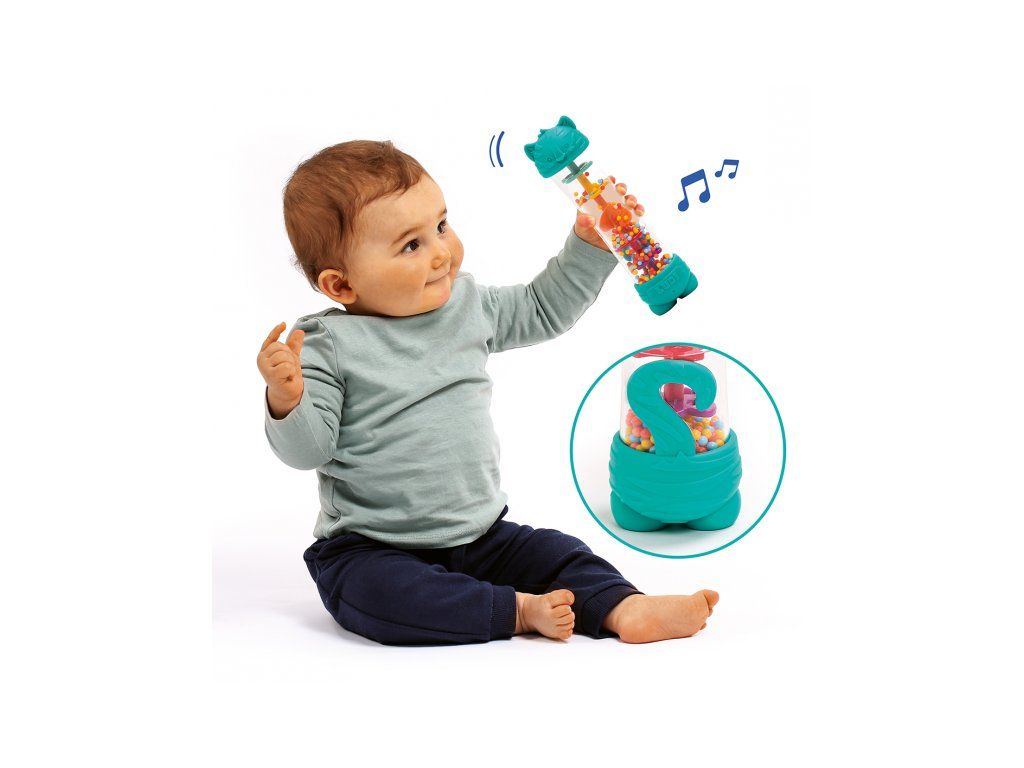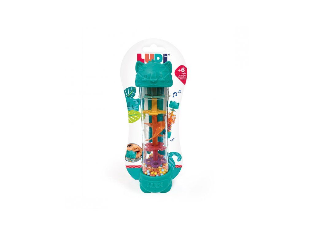 Hrkálka s korálkami dažďová palička je senzorická hračka pre deti od 6 mesiacov, ktorá kombinuje jemný upokojujúci zvuk, vizuálnu zábavu aj hryzátko pre obdobie rastu zúbkov. V priehľadnom tubuse sa pri otáčaní hračky pomaly presýpajú farebné guličky a vytvára príjemný upokojujúci „dažďový“ zvuk. Dieťa zároveň vidí pohyb guličiek a postupne chápe súvislosť medzi vlastným pohybom a výsledkom. Zakončenie hračky v podobe tigrie hlavy a nôh slúži aj ako hryzátka na úľavu citlivým detským ďasnám pri prerezávaní prvých zúbkov.