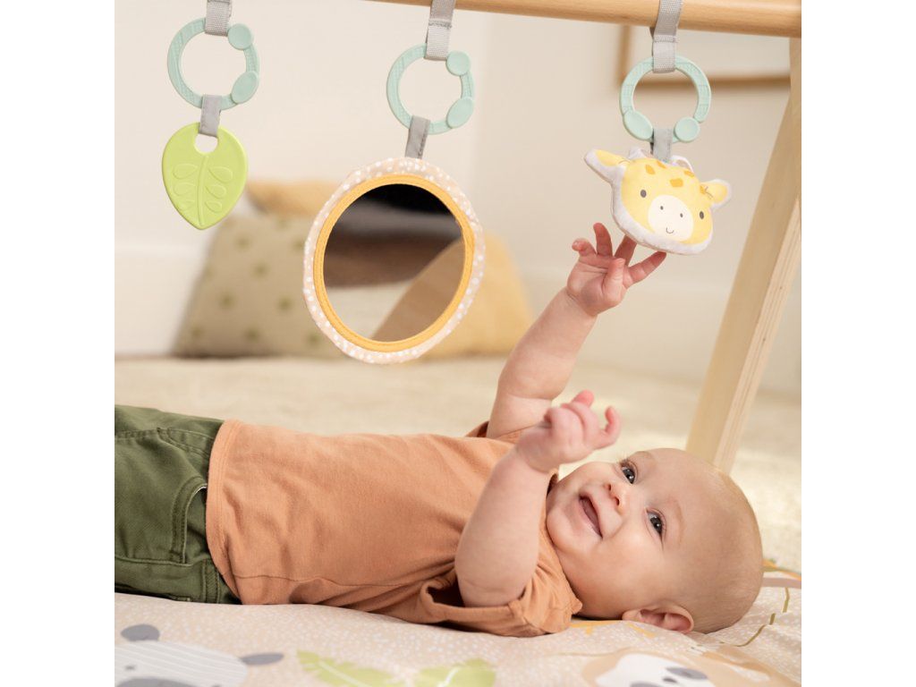 - Súčasťou balenia: plameniaková žirafa s praskaním, textúrovaný lístok, jemná zebra, sloník s praskaním, látkové zrkadielko