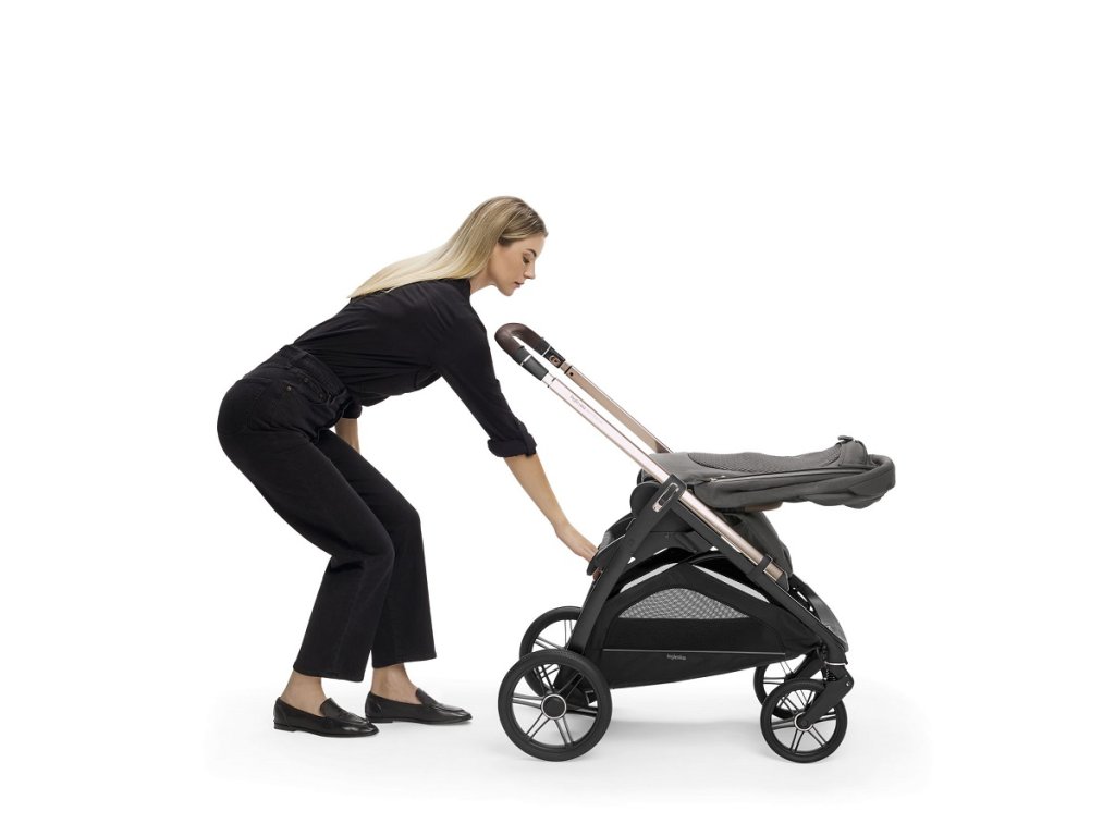 - Použitie kočíka je jednoduché a praktické-ľahko si poradí so všetkými typmi povrchov vďaka veľkým polyuretánovým kolieskam s tlmením nárazov (priemer 196 mm vpredu a 260 mm vzadu).
