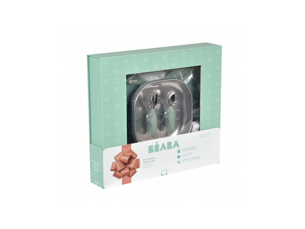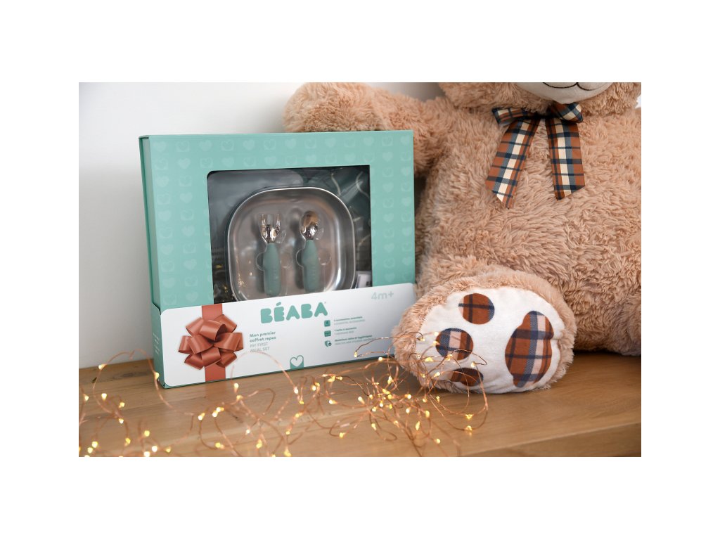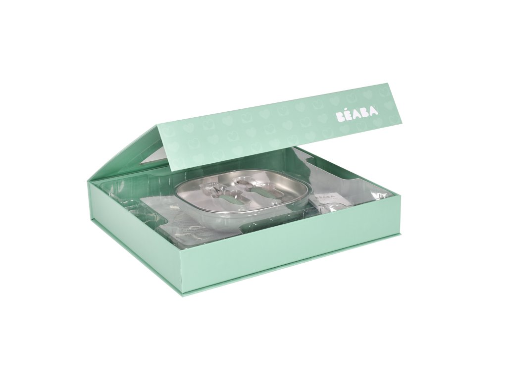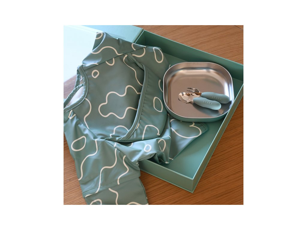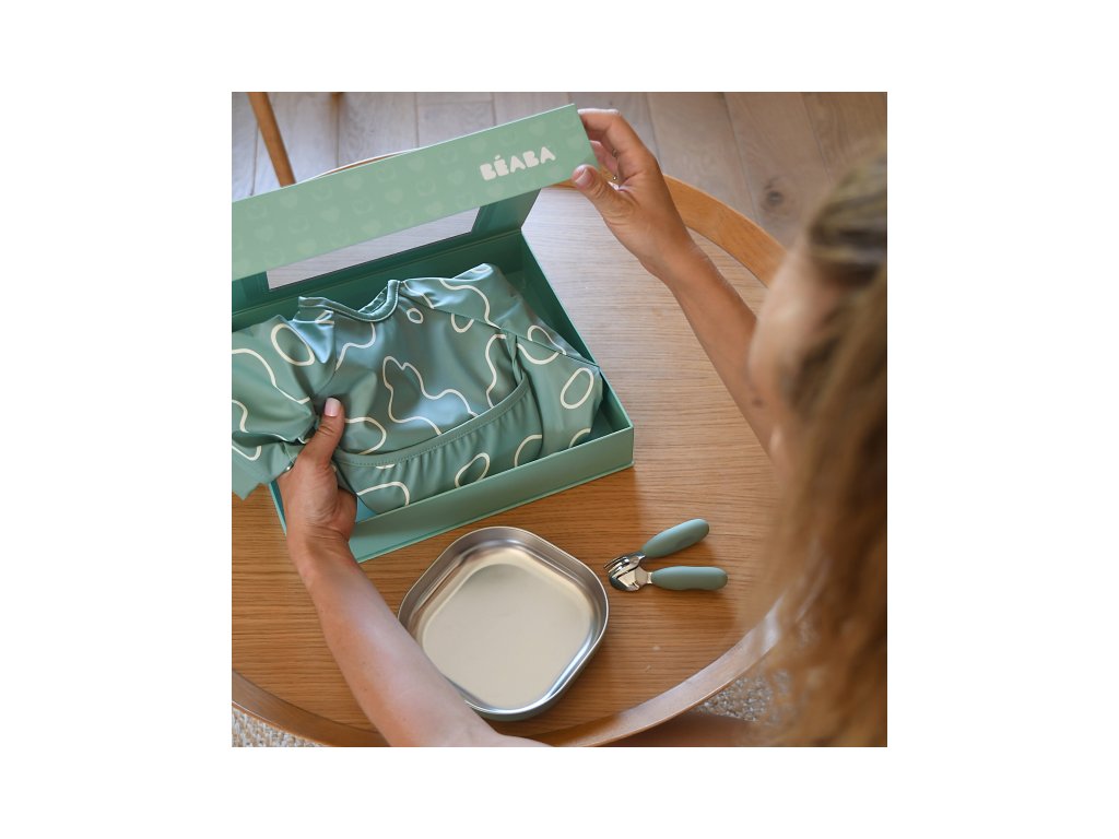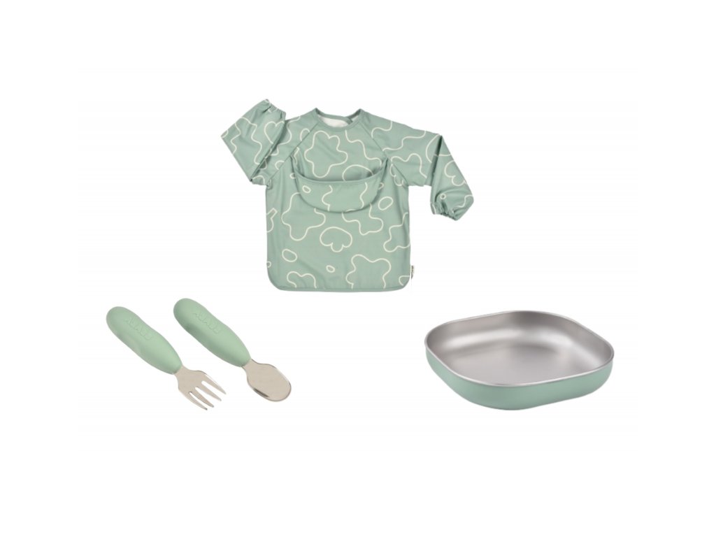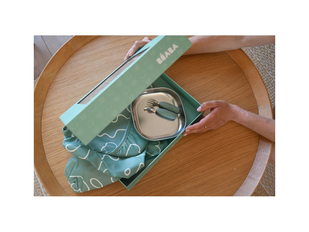 Jedálenskú sadu pre najmenších tvorí nerezový tanier so silikónovou povrchovou vrstvou, ergonomická tréningová lyžička a vidlička a podbradník s odopínacími rukávmi a vreckom na omrvinky. Krásnu krabičku, v ktorej je sada zabalená môžete používať aj ako krabičku na drobnosti.
