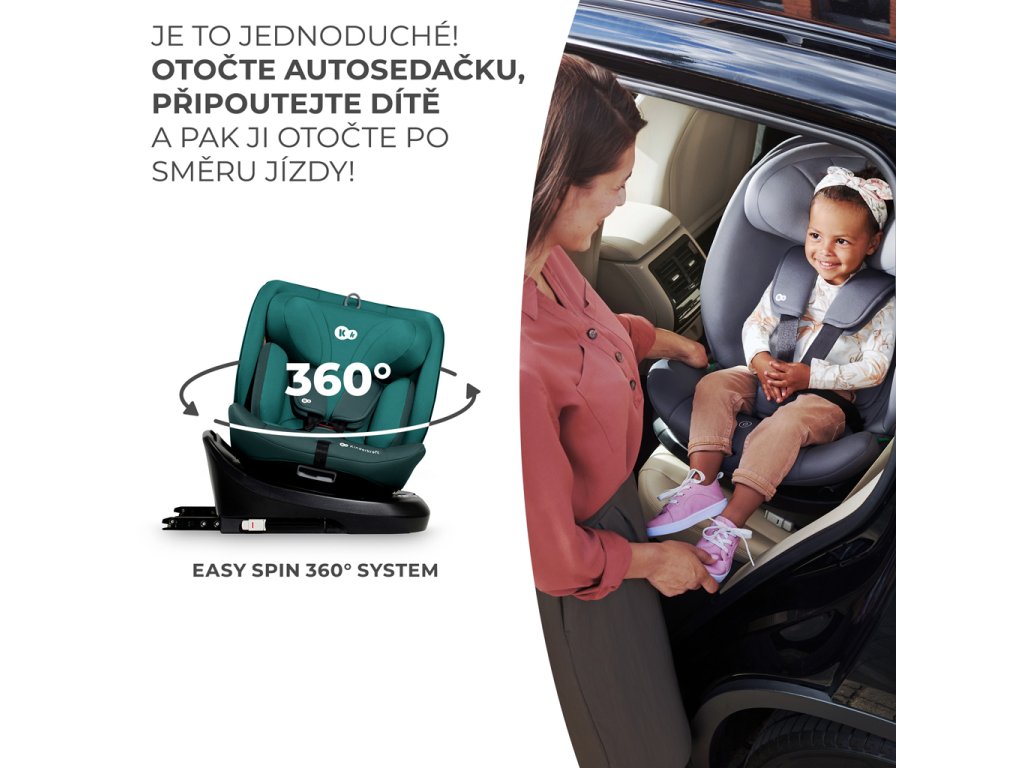 Tento systém výrazne uľahčuje pripútanie dieťaťa do autosedačky. Stačí stlačiť ľahko dostupné tlačidlo a otočiť sedadlo smerom k sebe. EASY SPIN 360° zároveň umožňuje rýchlu zmenu polohy (RWF / FWF) bez nutnosti demontovať celú autosedačku.