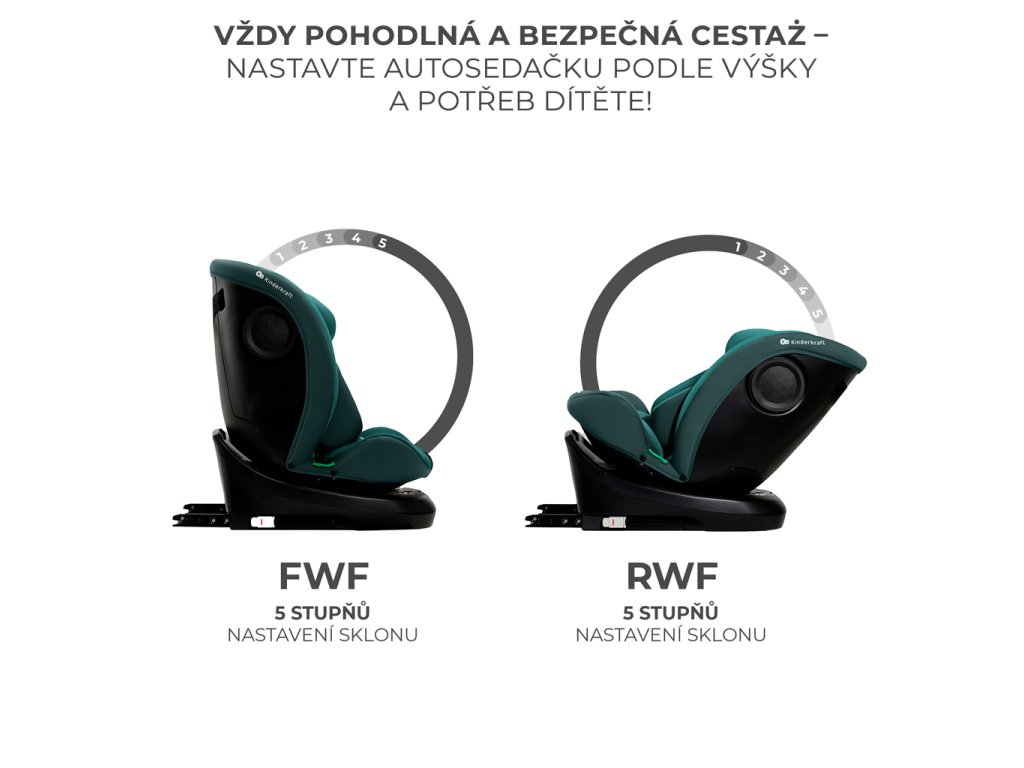 Autosedačka rastie spolu s dieťaťom – ponúka až 12 polôh výšky opierky hlavy a 5 polôh sklonu operadla (pri RWF aj FWF). Správne nastavenie výšky podľa dieťaťa výrazne zvyšuje bezpečnosť.