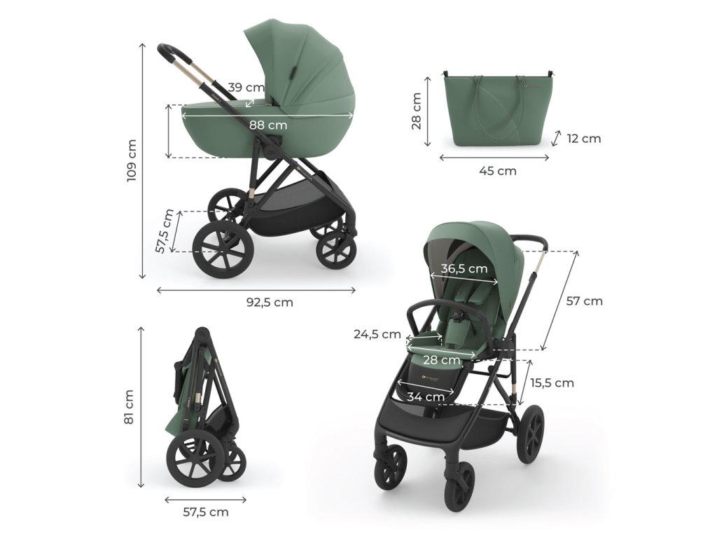 - Vybavenie v sade: hlboká korba, športová sedačka, rám s kolesami, taška pre rodičov, nákupný kôš