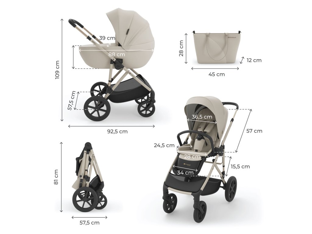 - Vybavenie v sade: hlboká korba, športová sedačka, rám s kolesami, taška pre rodičov, nákupný kôš