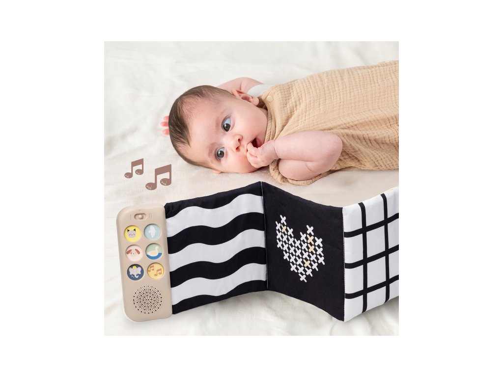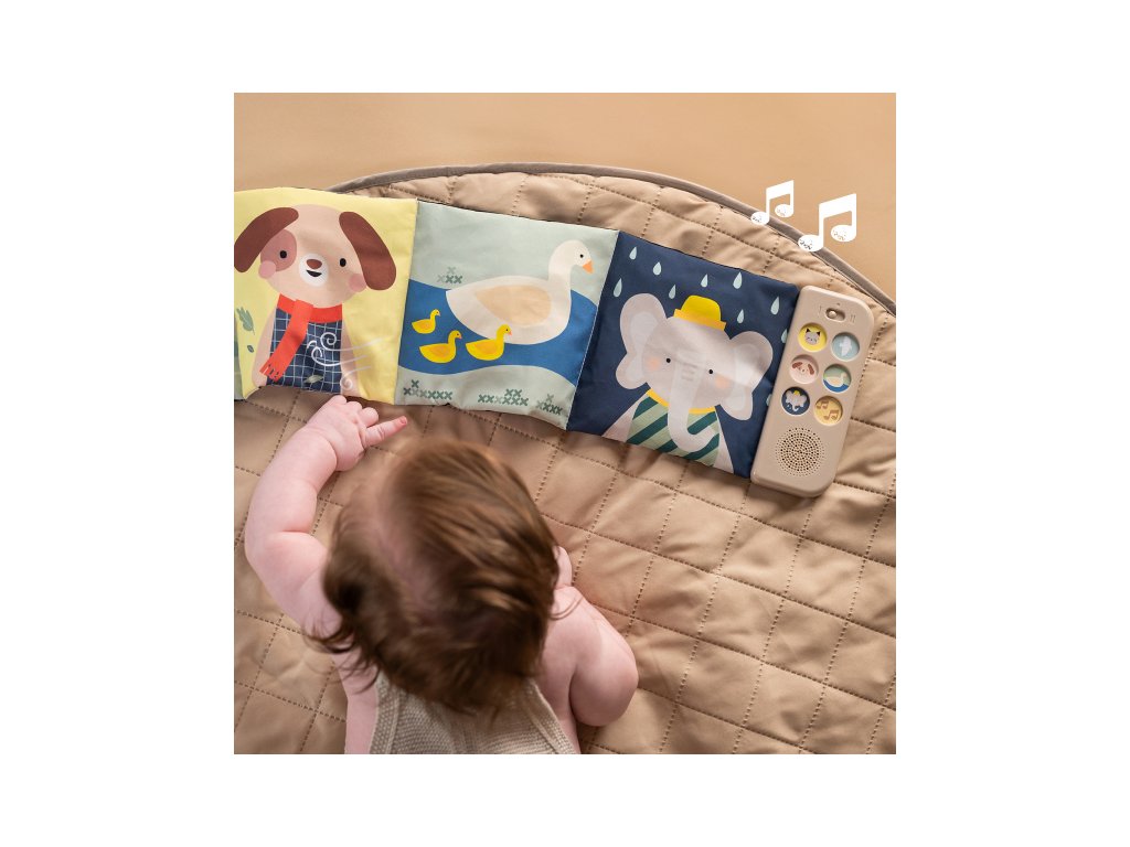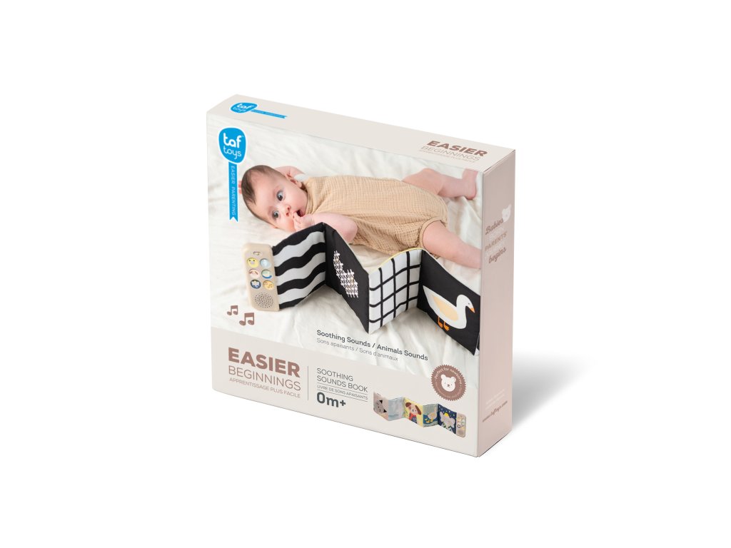 Obojstranná textilná knižka Taf Toys pomôže zabaviť a upokojiť bábätko už od narodenia. Knižka samostatne stojí a je tak ideálna na hranie na brušku. Vďaka klipom ju ľahko umiestnite aj do kočíka na zabavenie dieťaťa na cestách.