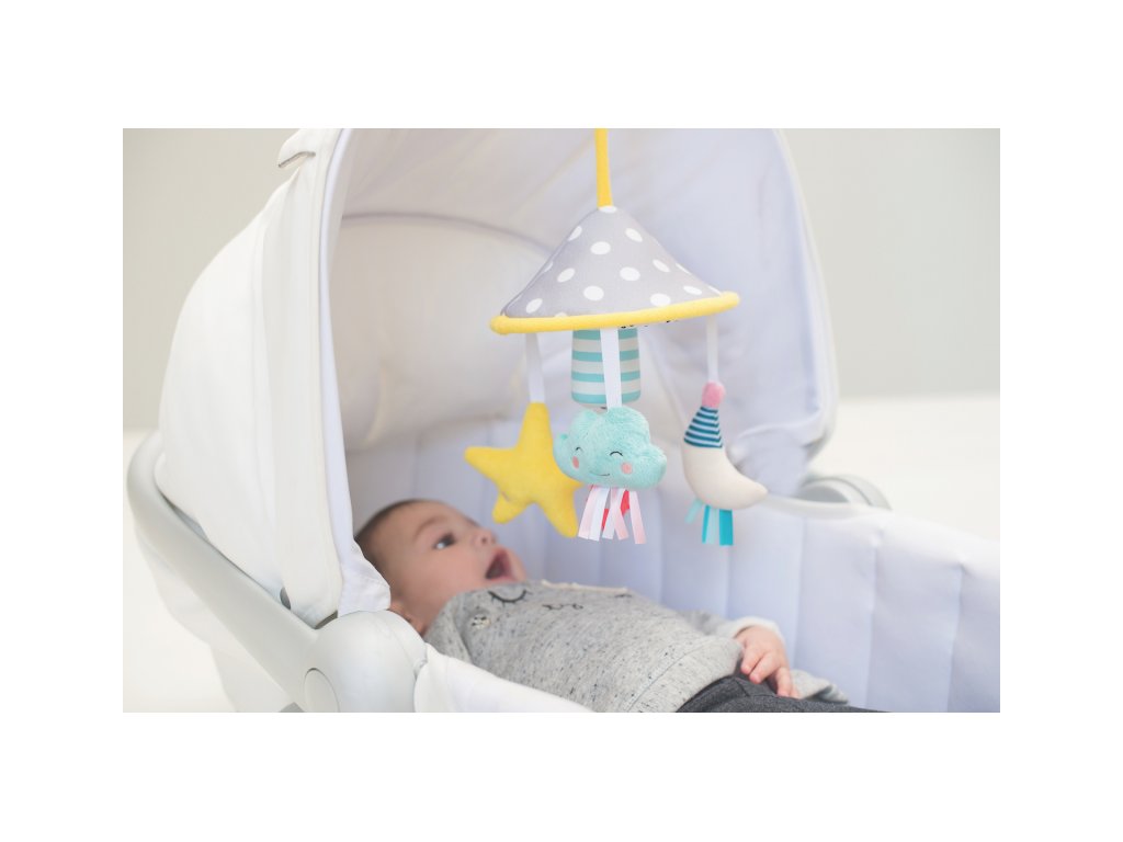 Kolotoč sa ľahko pripevní na kočík s pomocou veľkého klipu. Zaistí dieťaťu zábavu na cestách.